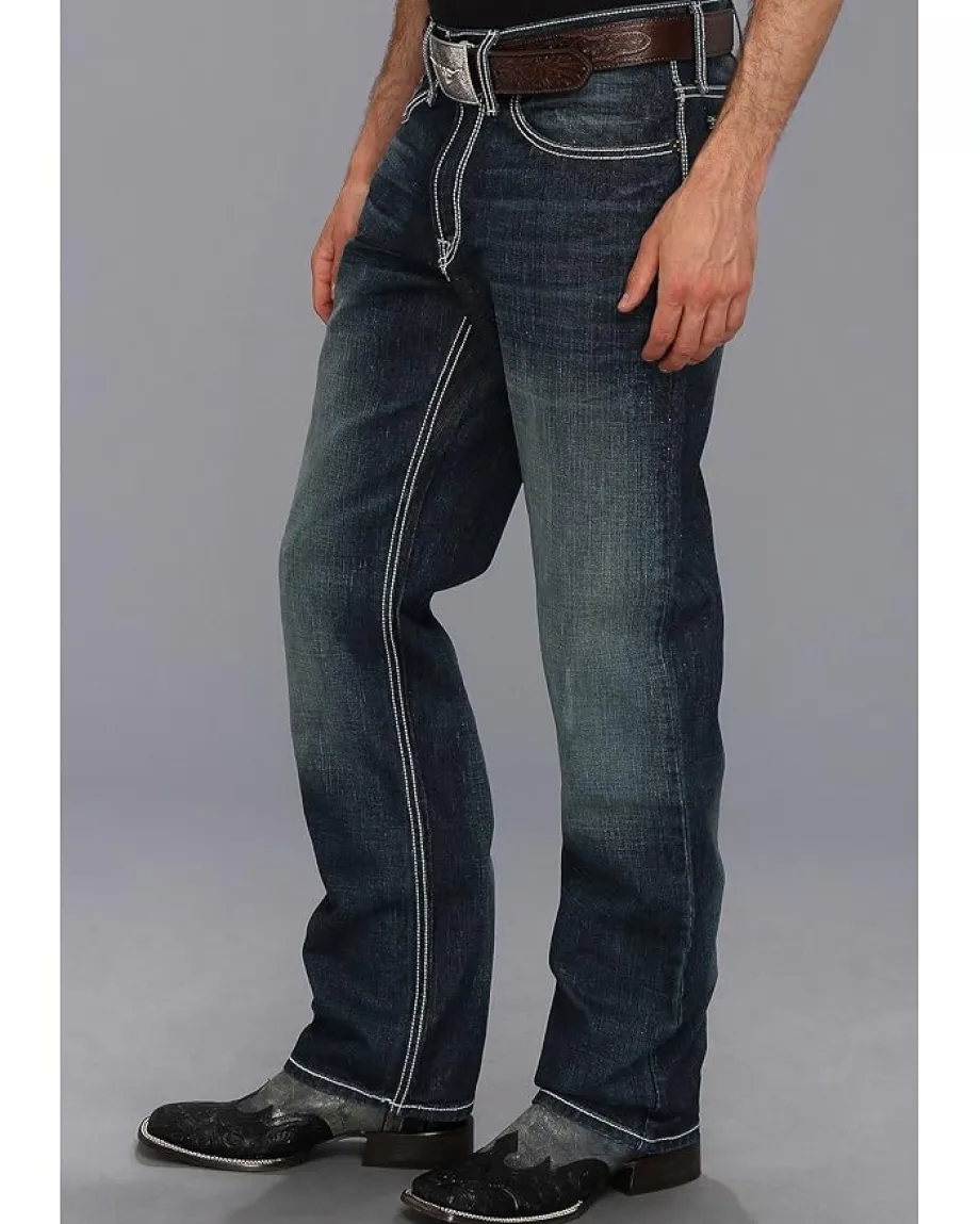 - Mid-rise jean in a dark stone wash brings a classic appeal.