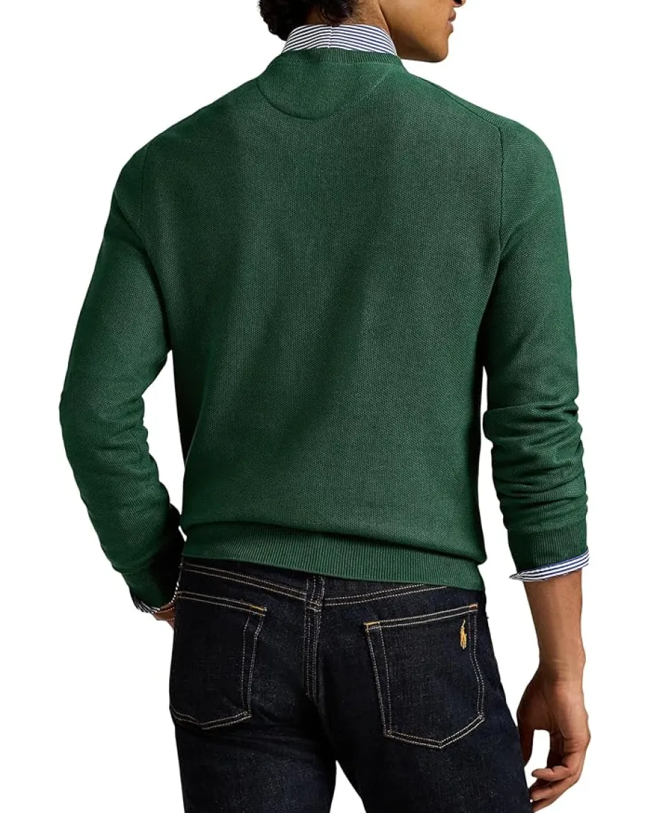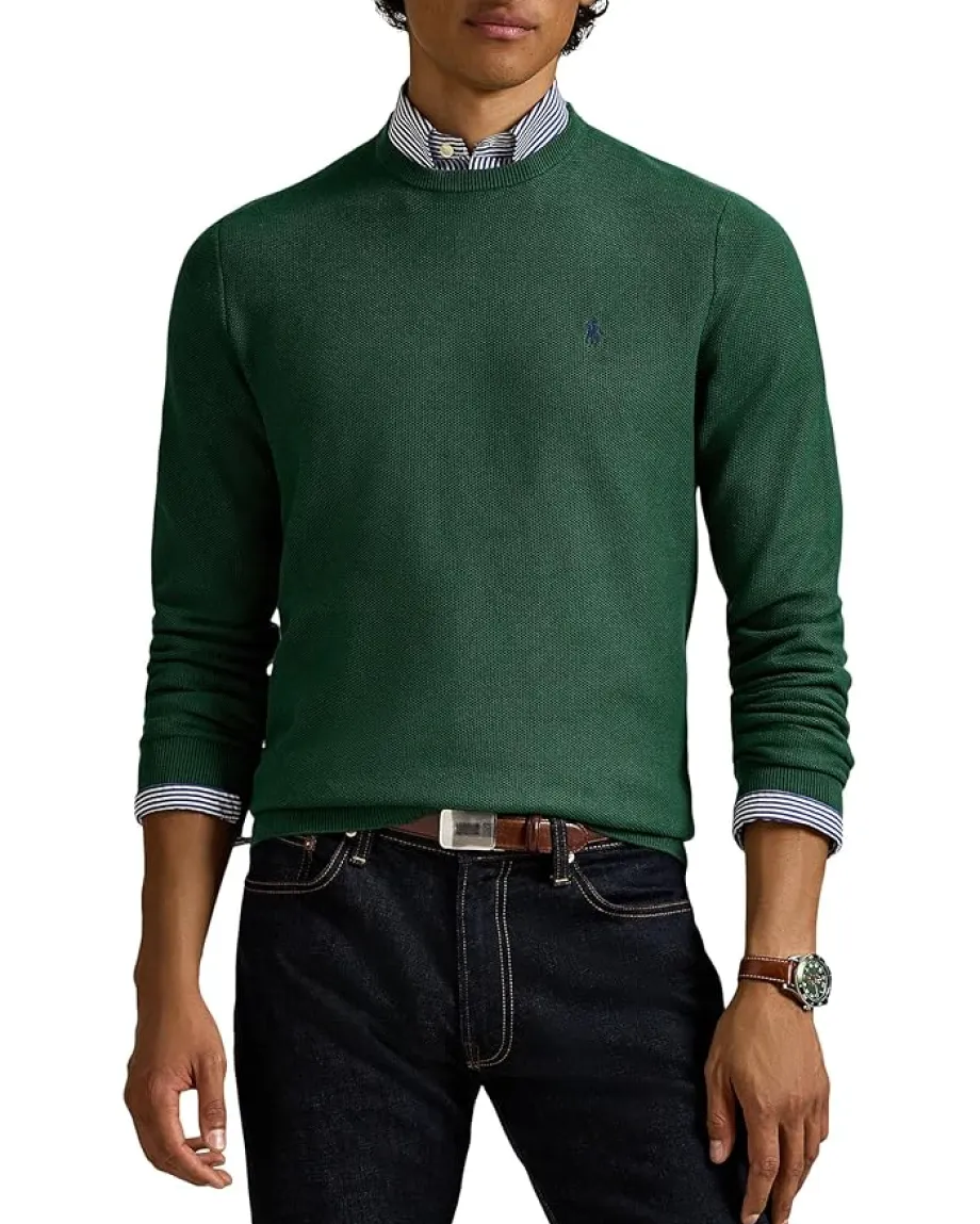 - The Polo Ralph Lauren® Mesh-knit Cotton Crewneck Sweater is a lightweight sweater that gets a tactile update with a textured stitch and ultra-soft cotton. It is styled with long sleeves, rib-knit cuffs, a crew neckline, and a straight rib-knit hem. This pullover sweater offers a regular fit that is wider at the chest while still maintaining a modern silhouette.