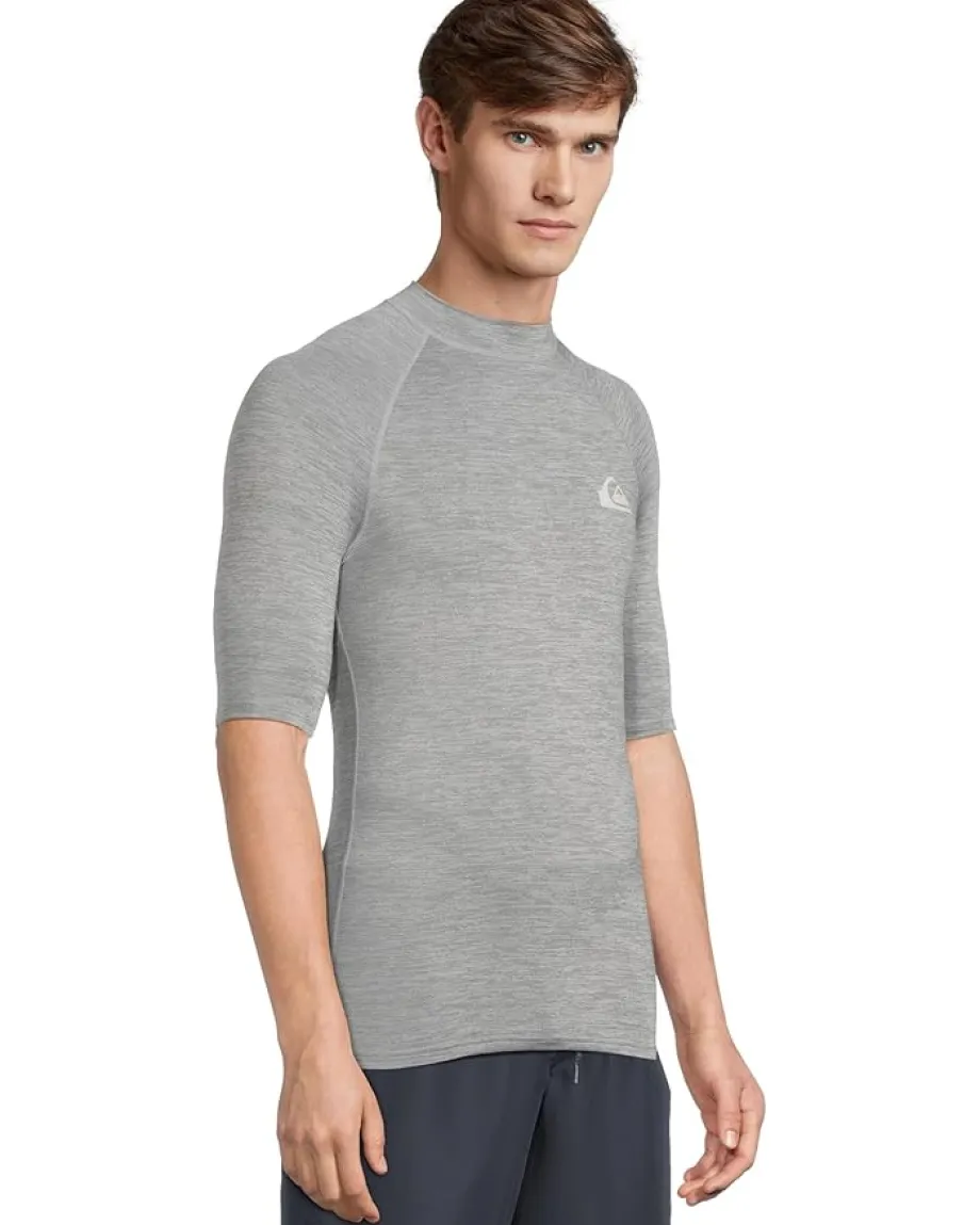 - Stay ahead of the tide styling the Quiksilver® Everyday UPF 50 Short Sleeve Surf Tee, crafted for surfers who demand both performance and style. This snug-fit rash guard from the Everyday Collection is made from recycled yarn and infused with UVflight technology, offering 50+ UPF sun protection to keep harmful rays at bay. Moisture-wicking fabric pulls sweat away, ensuring a dry, cool ride, while chlorine resistance boosts durability for endless surf sessions. Featuring a mock neck, short sleeves, and a pullover design, this tee is your go-to for effortless comfort and high-performance action.