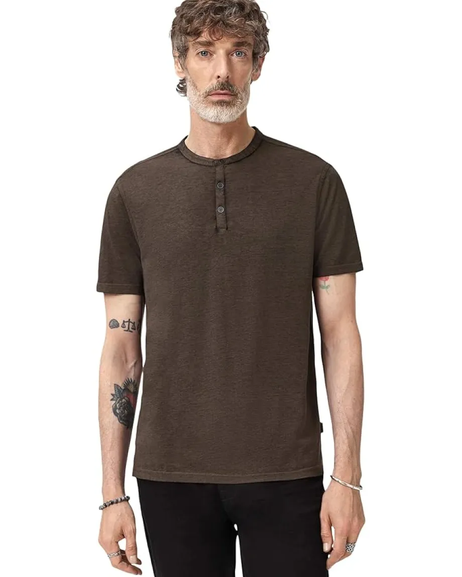 - Exude both stylish and comfy vibes wearing the John Varvatos™ Duke Henley Top. The pull-on style top features a Henley neck with a quarter-button closure, short sleeves, and a straight hem.