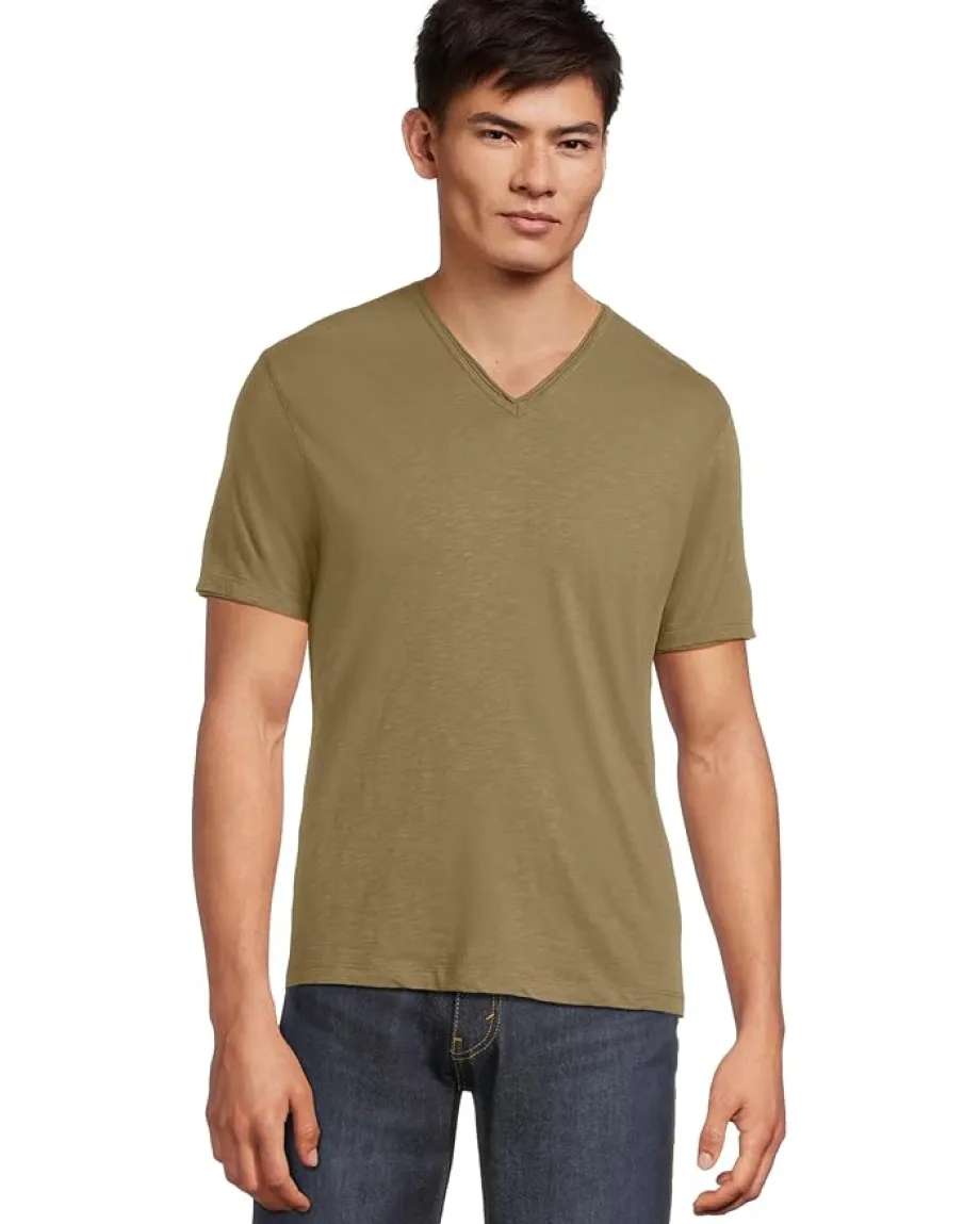 - Cut with a V-neck and finished with raw edges, the John Varvatos™ Miles V Neck Tee is a must-have for anchoring your everyday style. Its ultra-soft organic cotton fabric presents a refined texture, easily layering under a shirt jacket or worn as a standalone piece.