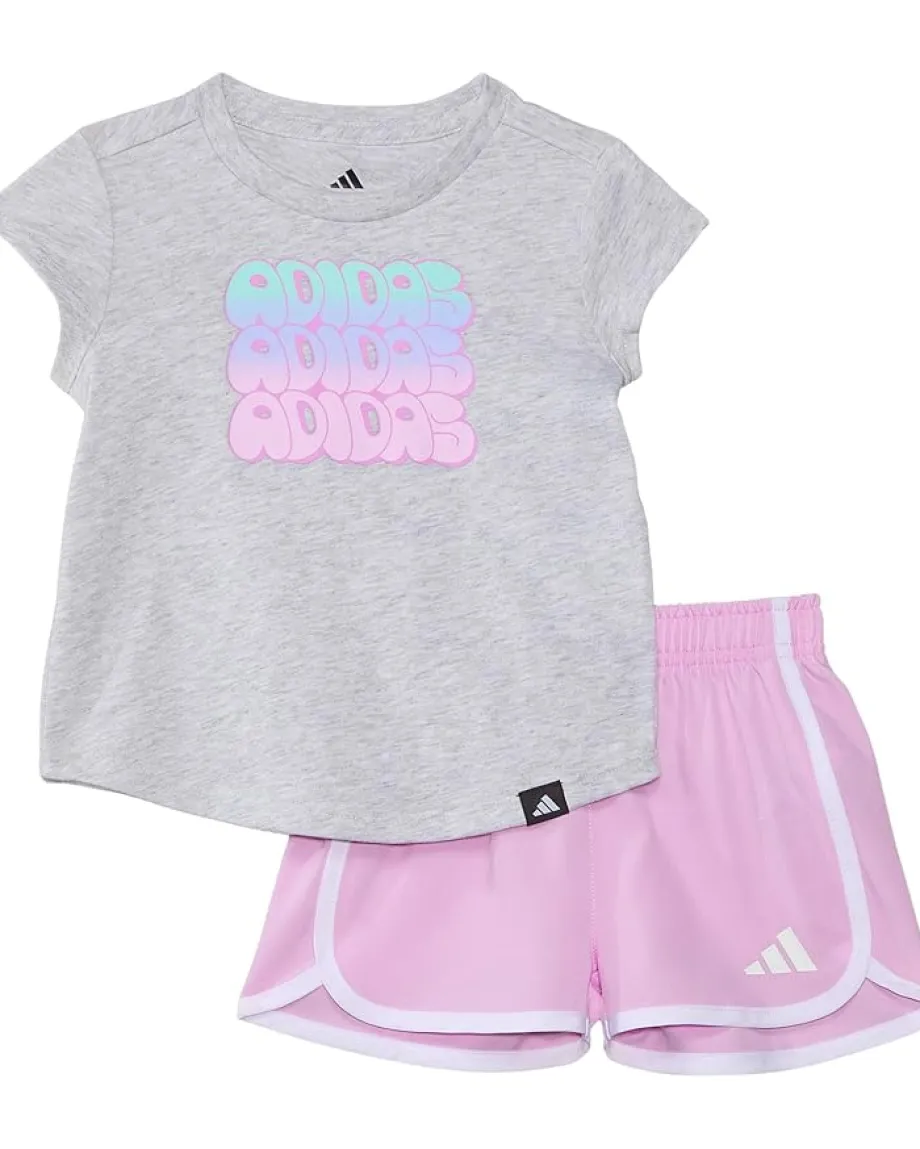 - The adidas® Kids Cap Sleeve Heather Tee & Woven Short Set is expertly designed for your little one’s comfort and freedom of movement. The pull-on style tee features a crew neck, cap sleeves, fun graphic print on the chest, and a slightly curved hem. The pull-on style shorts feature a mid-rise elasticated waistband, contrasting details, adidas® logo detail at the front, and curved hems.