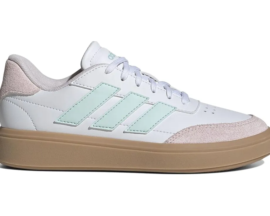 - Introducing the unisex adidas® Kids Court Block Shoes, an inspired blend of sport and street style for juniors. Fashioned with a synthetic leather upper made from recycled materials, these shoes pair modern design with eco-consciousness. The traditional rubber outsole promises reliable support and durability while lace closure ensures a secure fit, perfect for casual strolls or spirited play. The low-top sneakers feature a faux leather upper, synthetic rubber lining, and a cushioned insole.