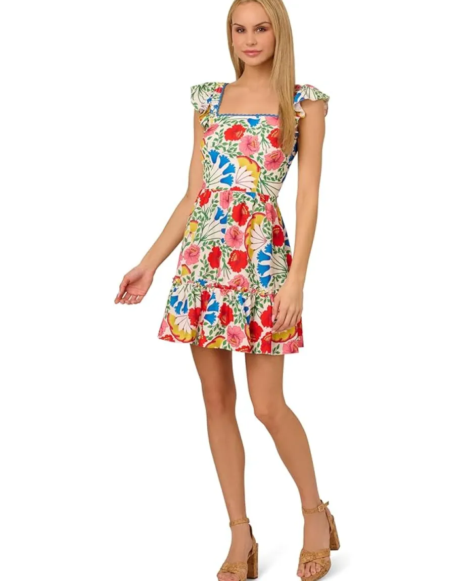 - From baby showers, and dinner dates, to special occasions, the Adrianna Papell® Flutter Sleeveless Short Dress serves as a perfect choice. Its allover floral print offers a fun and feminine touch. This printed dress is styled with short flutter sleeves, a square neckline with piping detail, and a flounce hem. The elasticized back hugs your curves for a flattering fit.