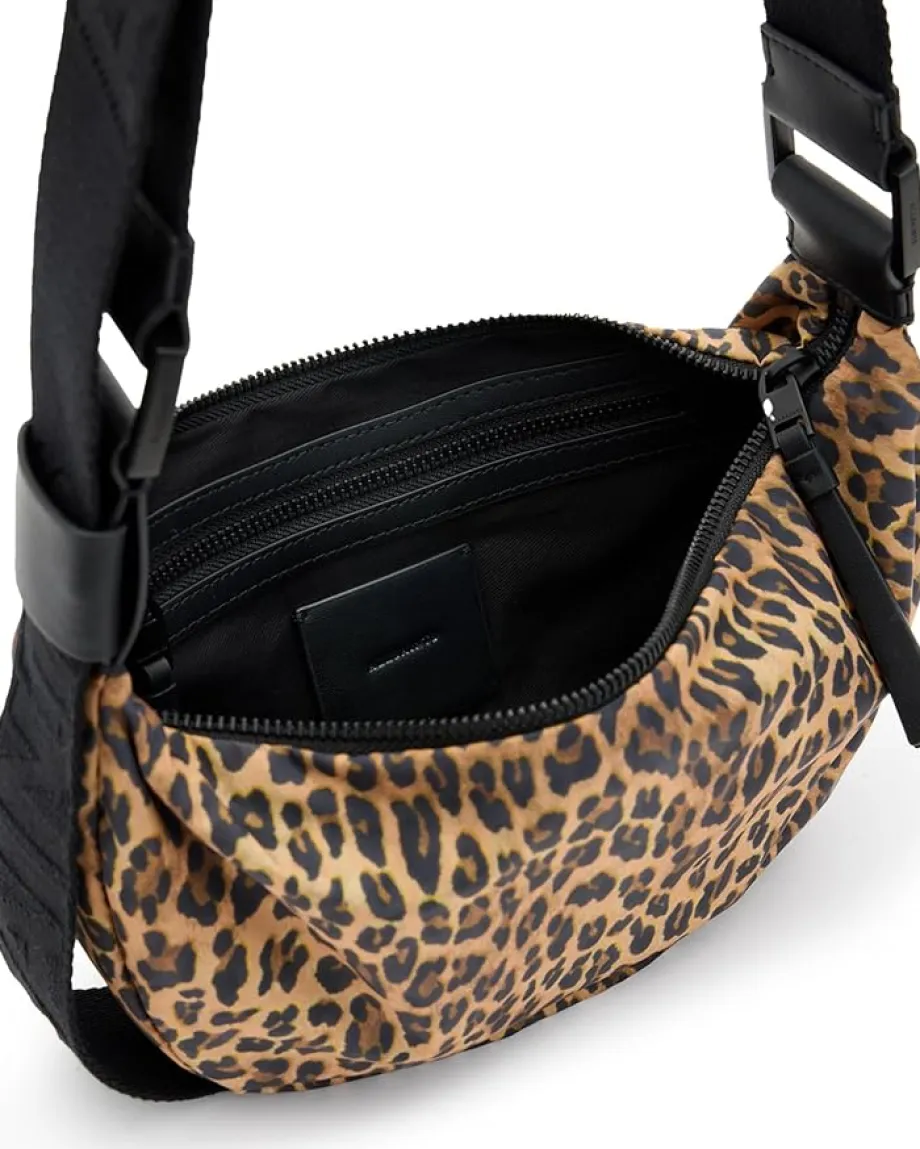 - Embrace urban elegance with the AllSaints™ Half Moon Nylon Xbody. Crafted from soft, slouchy silver nylon and accented with leather straps, it’s both chic and practical. The adjustable strap with branded buckle offers versatility, while its spacious compartment and multiple pockets keep your essentials organized. Zippered closure ensures security on the go.