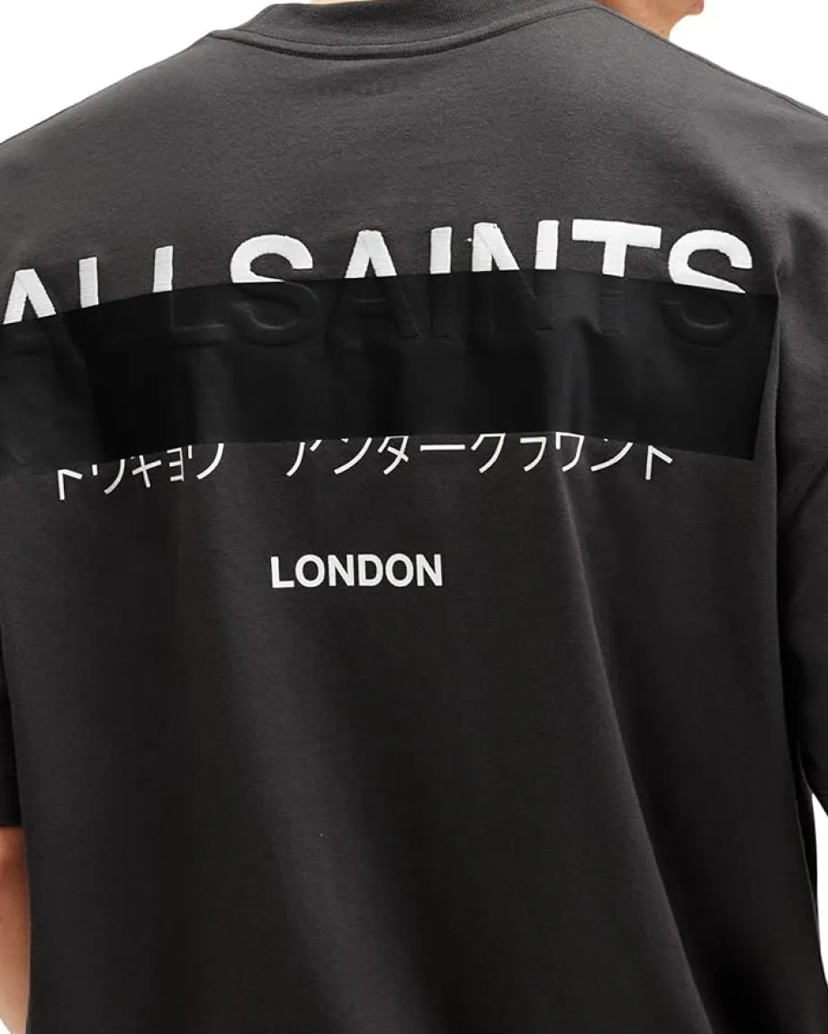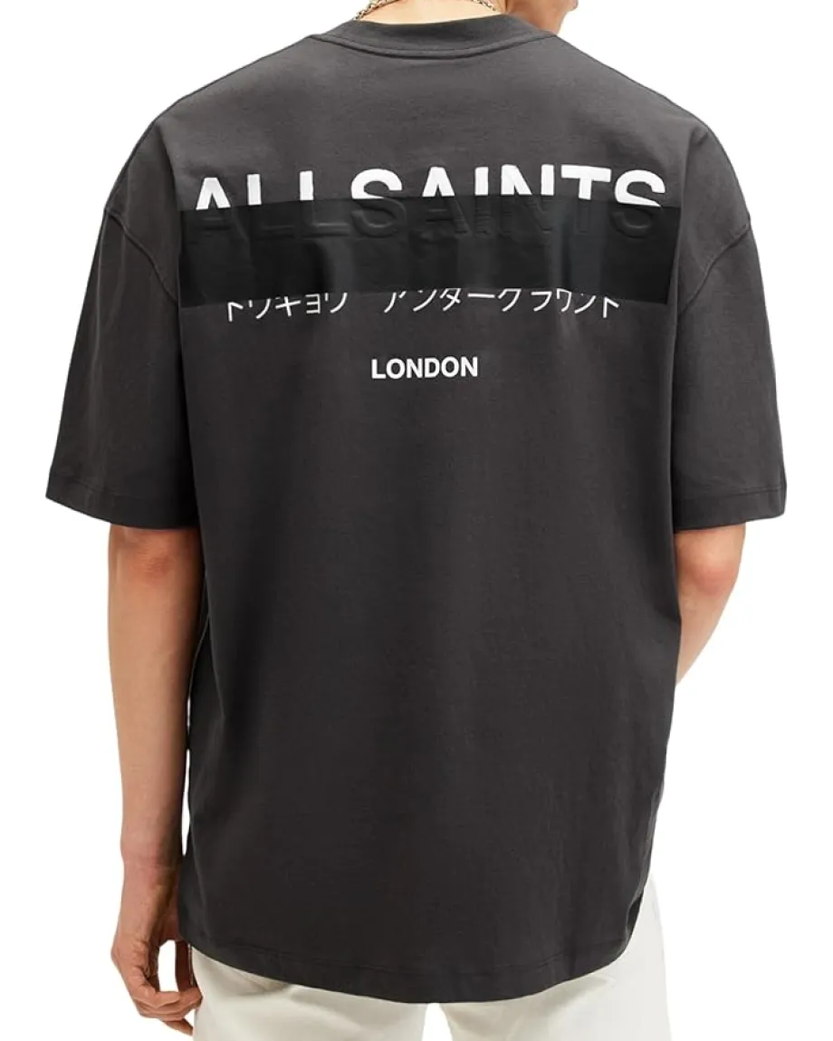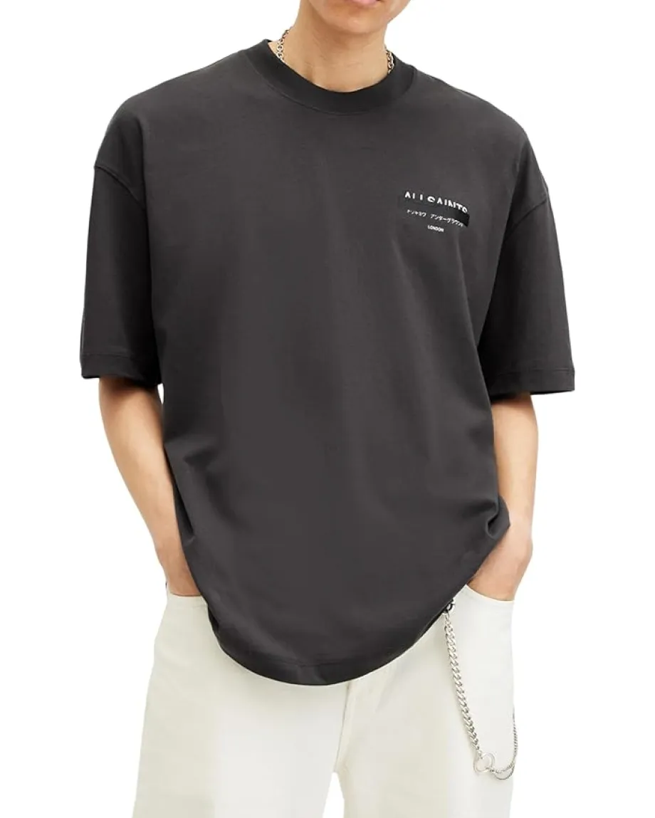 - Wear your personality on your sleeve with oversized AllSaints™ Redact Short Sleeve Crew neck shirt. This cotton shirt features ribbed neckband and refined twin-needle stitch detail, short sleeves with dropped shoulders, and signature embroidered logo on the left chest and at the centre back. Its pullover style and straight hem make it an easy-to-wear everyday essential.