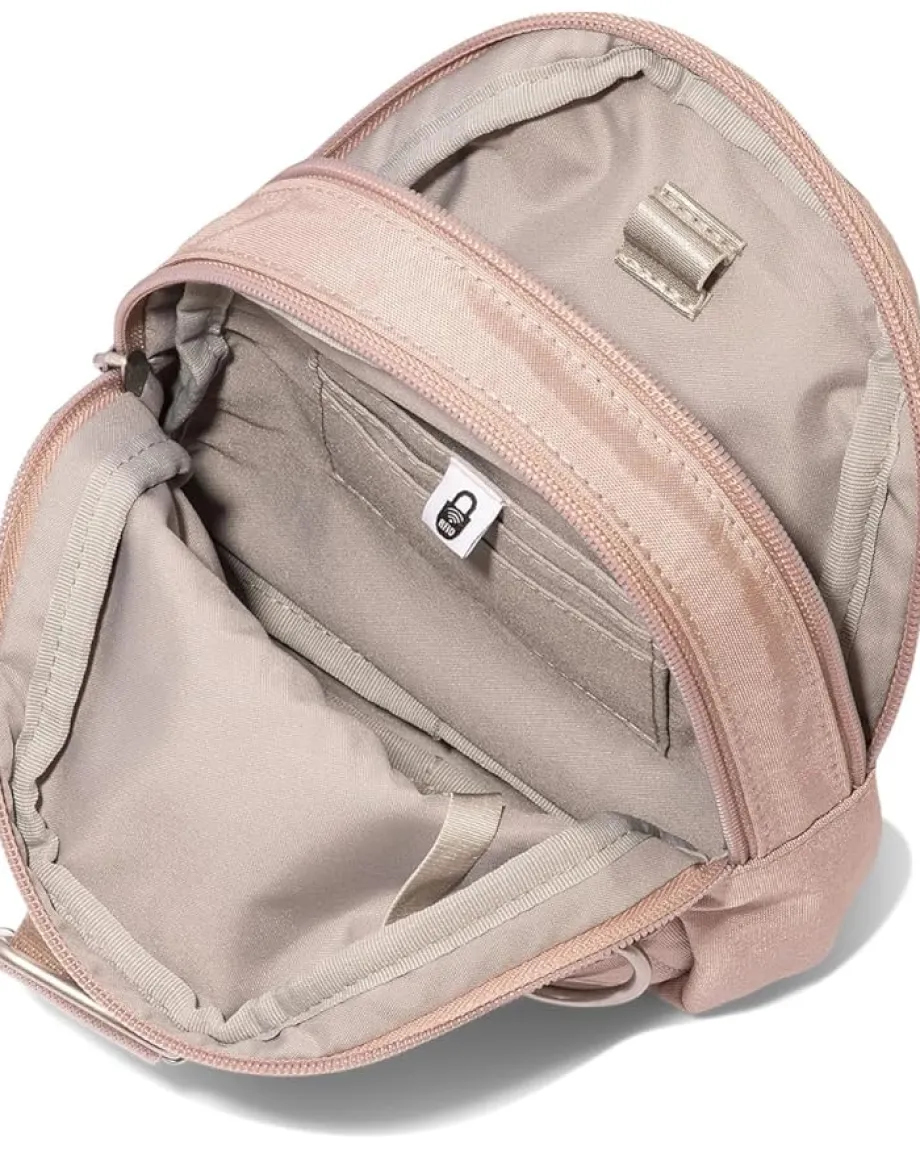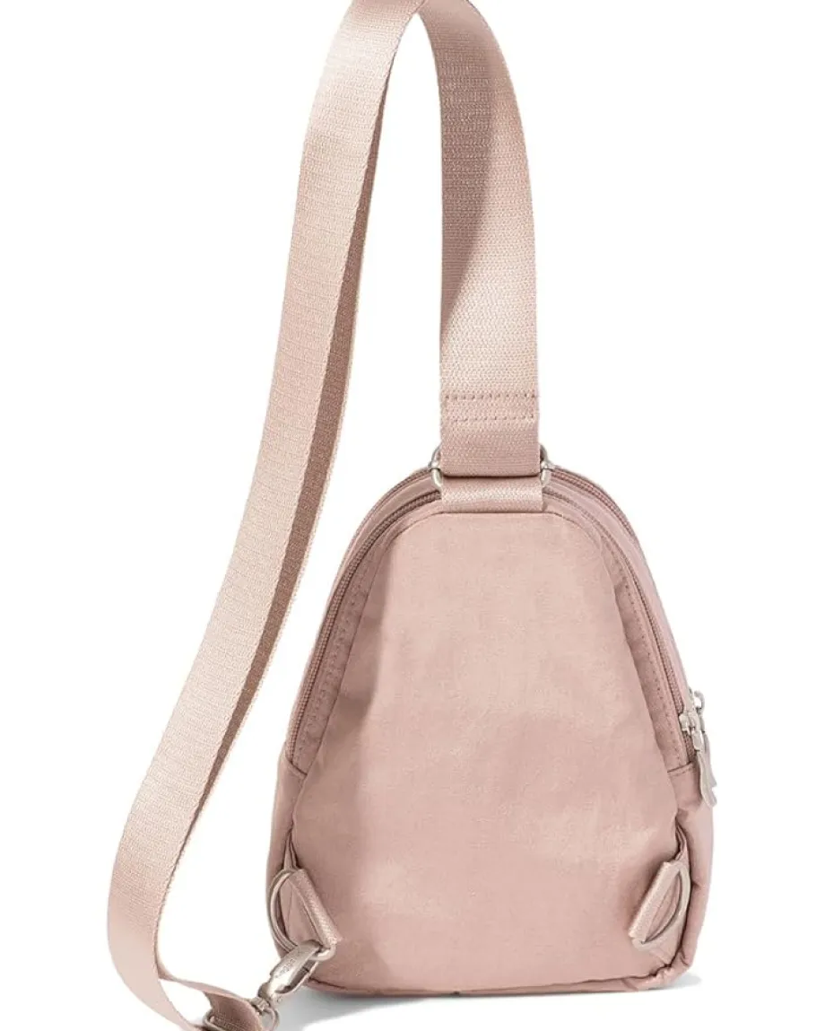- Designed with an adjustable strap that extends from 26″ to 54″, the Baggallini® Double Zip Mini Sling offers versatile styling. This stylish sling bag can be worn on the left or right side. Easy to carry around, this belt bag comes with a lipstick loop and key leash for added storage and functionality. Get ready for the office or a vacation trip with this chic sling bag.