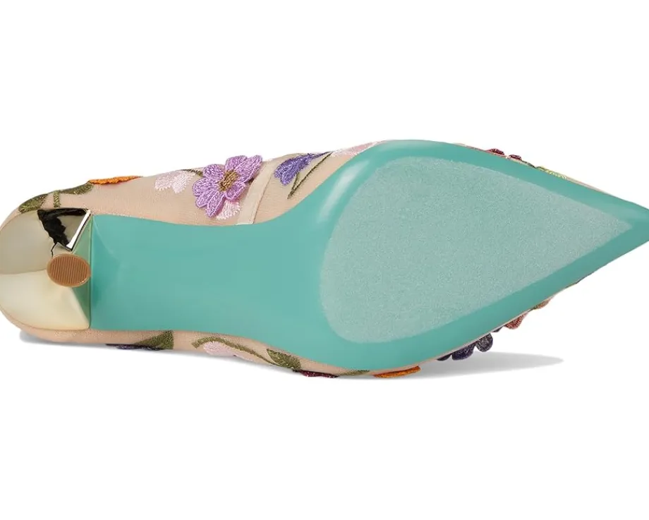 - The Blue™ by Betsey Johnson Aimey pumps are an elegant staple with their allover flower embellishments. These heeled pumps are made of a rubber insole and faux leather lining. The faux leather upper features a slip-on style for easy on and off. Style up your looks and outfits with these pump shoes.