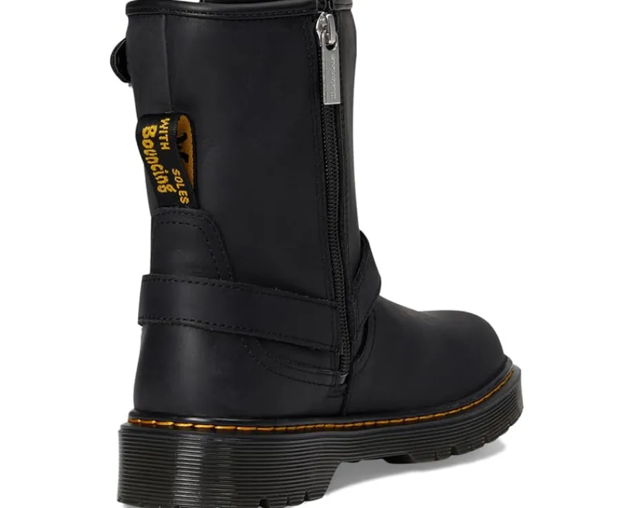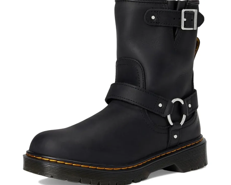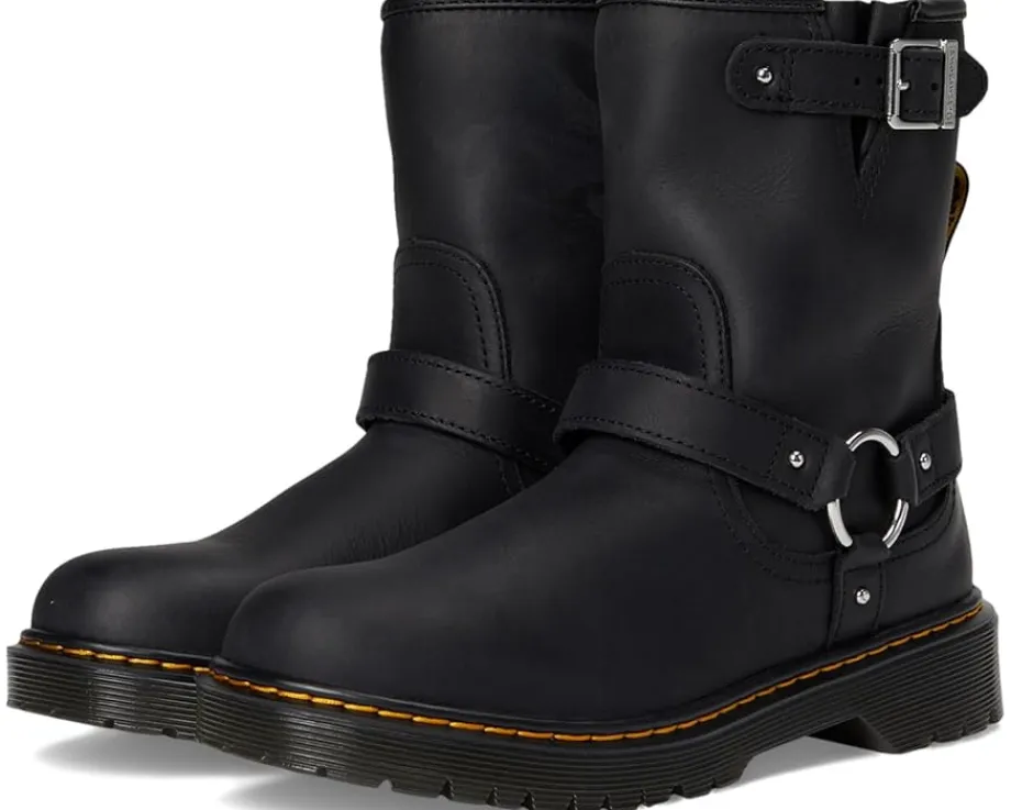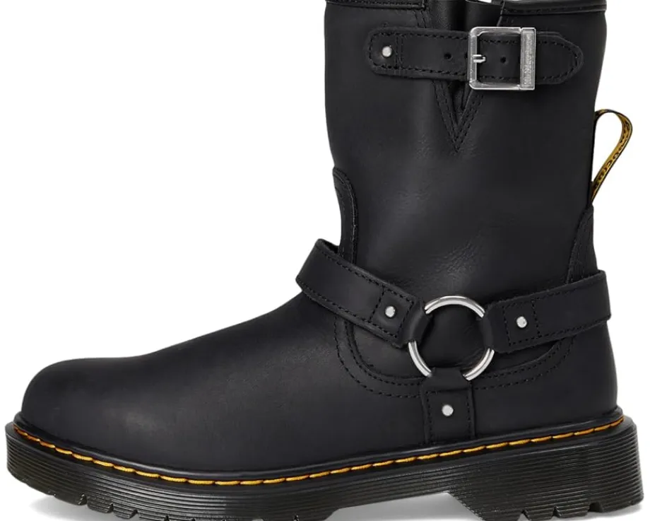 - The Dr. Martens® Genaya boot stands out and stands tall, taking a nod from biker style on an elevated Bex sole. The durable Wyoming leather is playground friendly and detailed with a harness and side zip for easy on/off. It is signed with DM’s unmistakable yellow stitching.