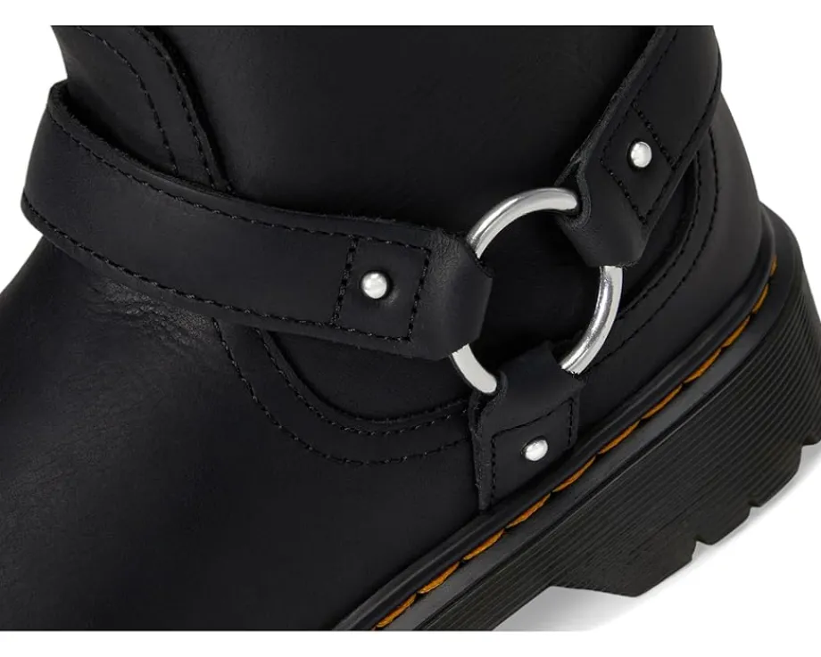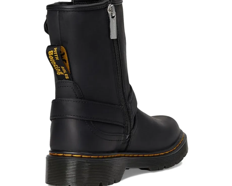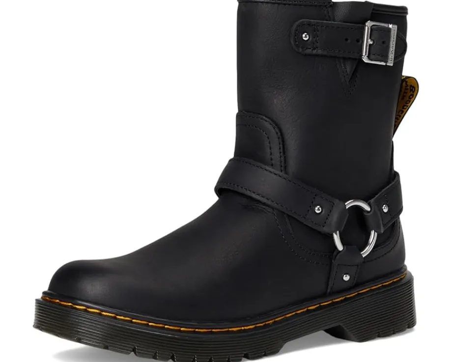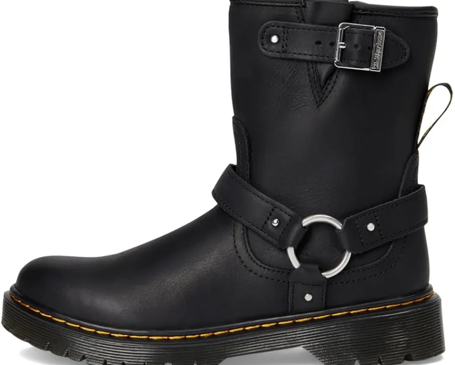 - The Dr. Martens® Genaya boot stands out and stands tall, taking a nod from biker style on an elevated Bex sole. The durable Wyoming leather is playground friendly and detailed with a harness and side zip for easy on/off. It is signed with DM’s unmistakable yellow stitching.