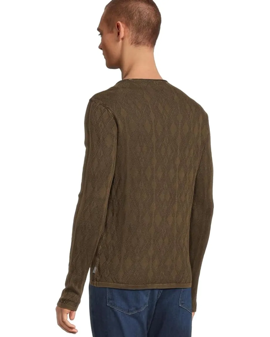 - The Brycen Crew features a geometric jacquard stitch in a broken argyle pattern, brought to life through a vintage wash that enhances its dimensional texture. Crafted in mercerized organic cotton, it’s finished with a subtle roll neck and forward shoulder seams for a polished but laid-back profile.