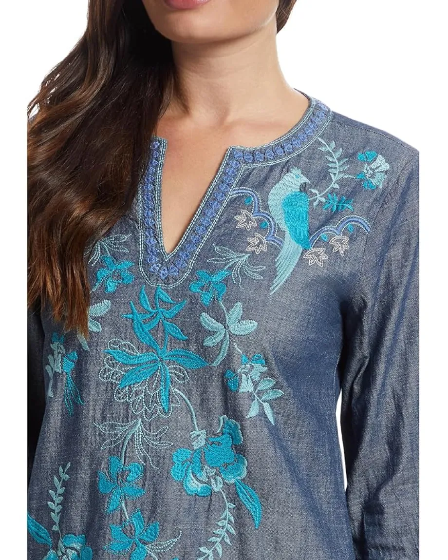 - Effortlessly chic, the Johnny Was® Ruffle Sleeve Dress – Kikio blooms with vibrant teal embroidery and a flowing, relaxed fit. Made from cotton, this mini dress offers a perfect blend of comfort and style. Its flared elbow-length sleeves, a V-neckline, and a floral hemline add a touch of romance, making it perfect for sunny getaways or evenings out.