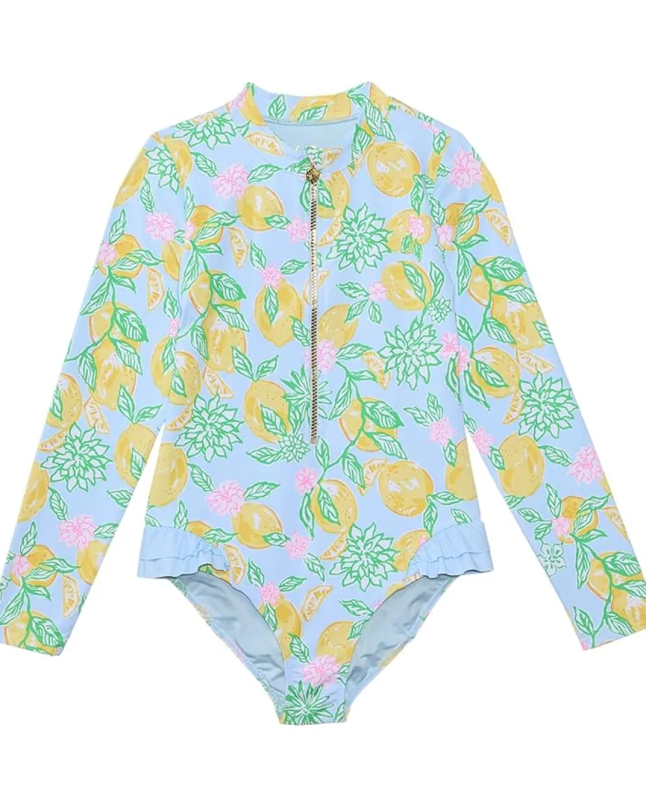 - The Lilly Pulitzer® Kids Denning Rashguard Upf 50+ is perfect for a day of fun in the sun. It ensures maximum sun protection while keeping your child comfortable and stylish. The front zipper allows for easy dressing, and the banded neckline adds a snug, secure fit. The fitted long sleeves provide extra coverage, while the delightful ruffle details at the leg openings add a charming touch.