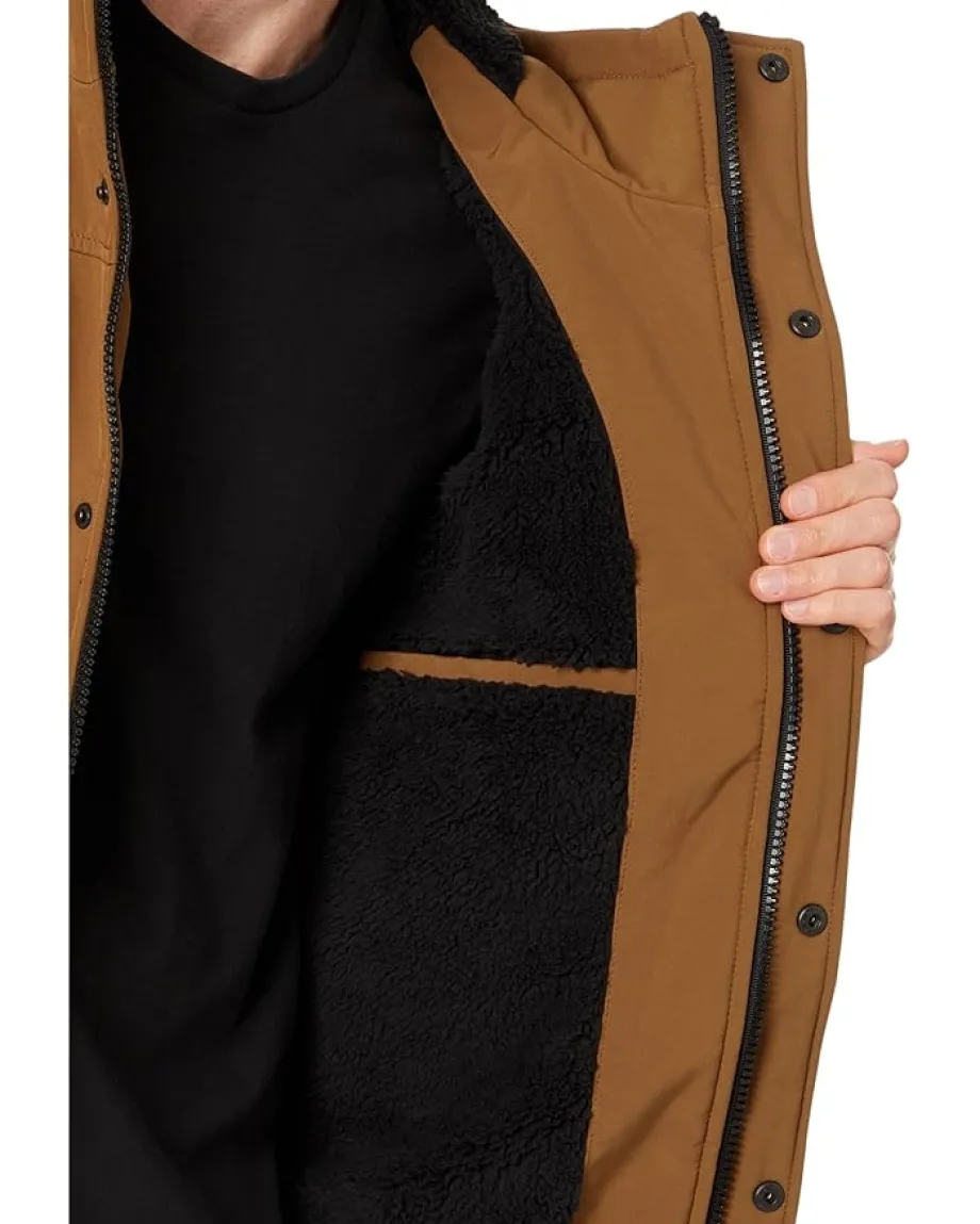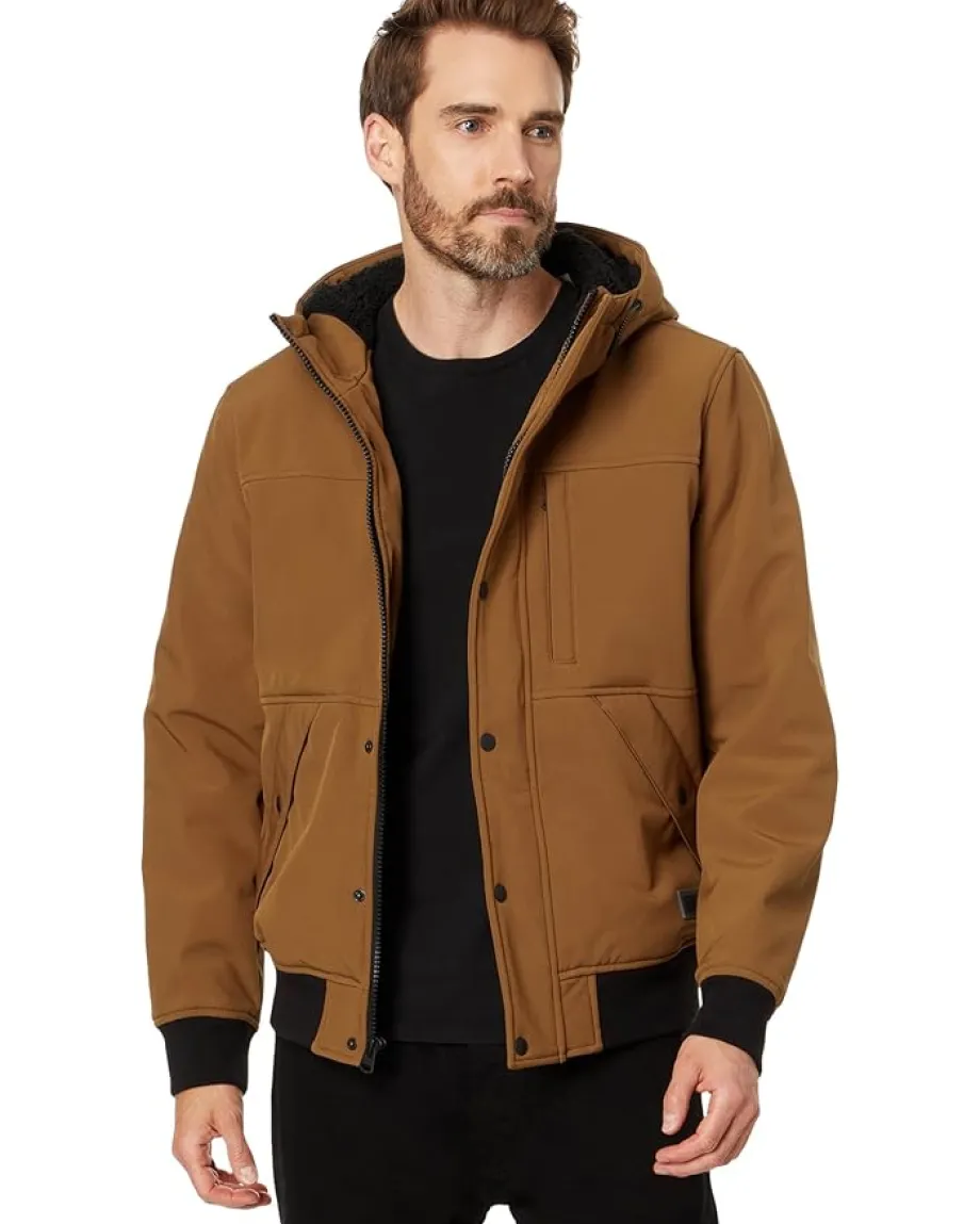 - Crafted for style, warmth, and comfort, the Levi’s® Softshell with Sherpa Lining and Hood jacket features a v-cut hooded collar with adjustable drawstrings, center front zip and button closure, long sleeves with fitted cuffs, two lower hand pockets with snap closure, and a straight fitted hemline.