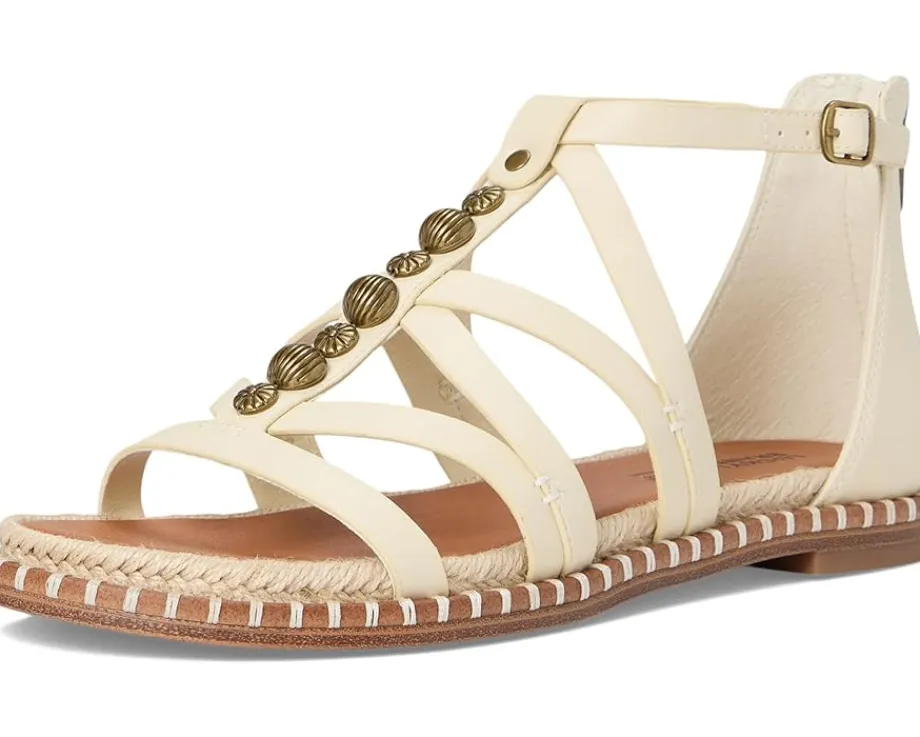 - Elevate your chic summer style this warm weather style in the Lucky Brand® Korina Beaded Gladiator Sandals. Crafted from a synthetic upper with beaded detailing on the vamp, these sandals feature crisscross straps with a round, open toe silhouette, an adjustable buckle strap, back zipper, and synthetic lining.