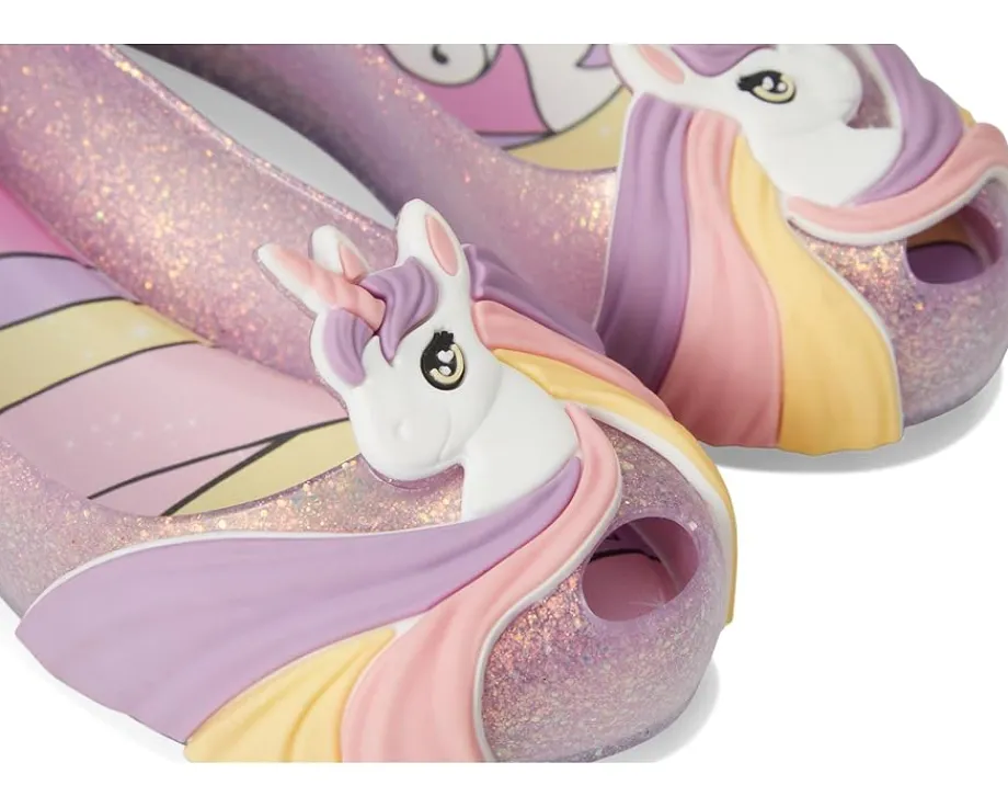 - With its stylish peep toe design and light-as-air construction, the Mini Melissa® Ultragirl Uni Kids Ballet Flats add comfort to your footsteps. The vegan slip-on style flats feature a polyvinyl chloride upper with oversized decorative unicorn detail and Greenflex EVA insole.