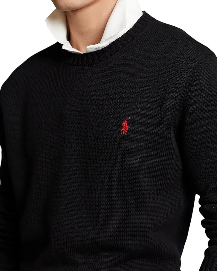 - The Polo Ralph Lauren® Cotton Crew Neck Sweater reintroduces the iconic Polo tiger patch, a distinctive design detail that Ralph Lauren premiered in the ’90s, as a mascot sporting a letterman jacket and jeans.