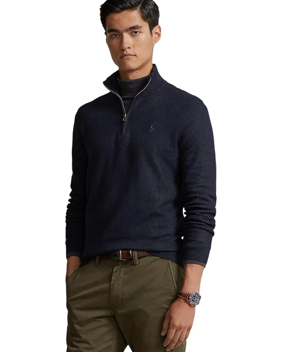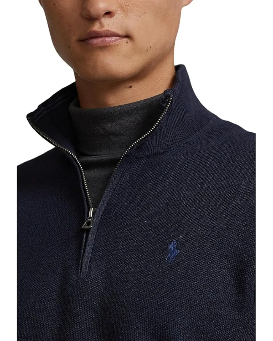 - A rib-knit mock neckline adorns the look of the Polo Ralph Lauren® Mesh-Knit Cotton 1/4 Zip Sweater. This high-quality sweater features a quarter-zip placket design which offers a fashionable look.