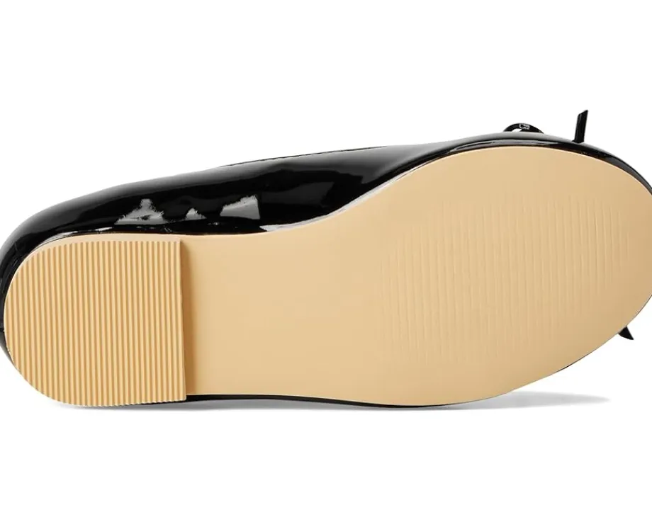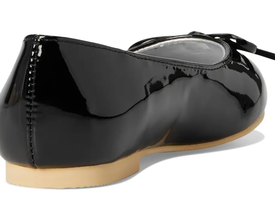 - Ballet flats featuring a black synthetic upper with a small bow on the toes.