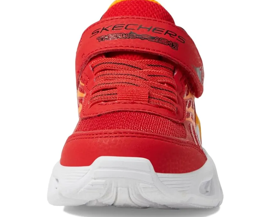 - Energize each stride styling SKECHERS® KIDS Thermo-Flash 2.0! Watch your child’s steps come alive with vibrant, light-up excitement. The shock-absorbing midsole, adorned with flame-themed tech, ensures comfort and style. The on/off light button adds convenience, while the fire-themed mesh and synthetic upper offers breathability. With stretch laces and an adjustable strap, these shoes fit perfectly. Complete with a rubber insole and flexible traction synthetic rubber outsole, it’s the ultimate blend of comfort and coolness.