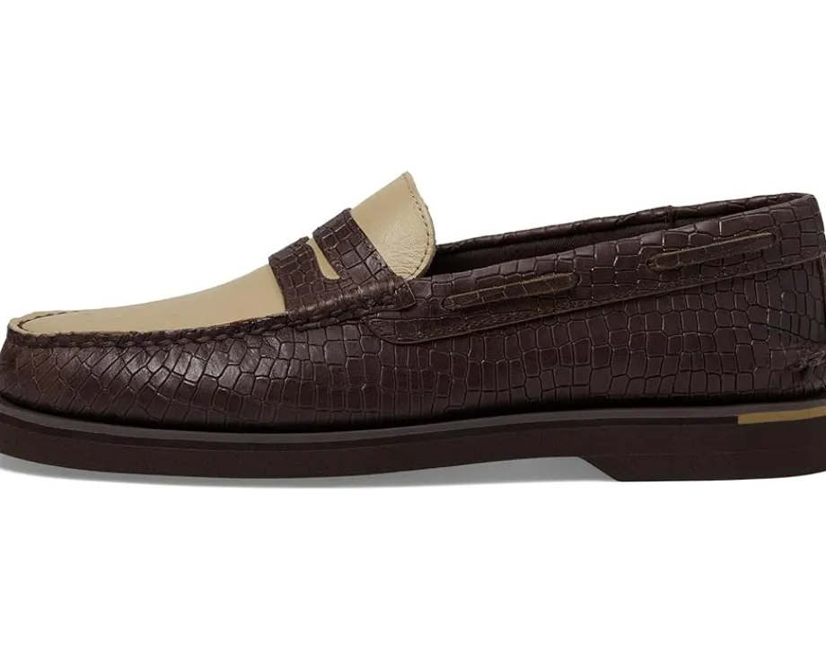 - With a tough outer look, the Sperry® A/O Penny Double Sole Boat Shoes provide all-day support through the cushioned Ortholite® insole. Made with lightweight Elevated PLUSHWAVE™ double sole, this slip-on footwear has a two-toned design with nubuck leather upper construction and hand-sewn moccasin toe silhouette.
