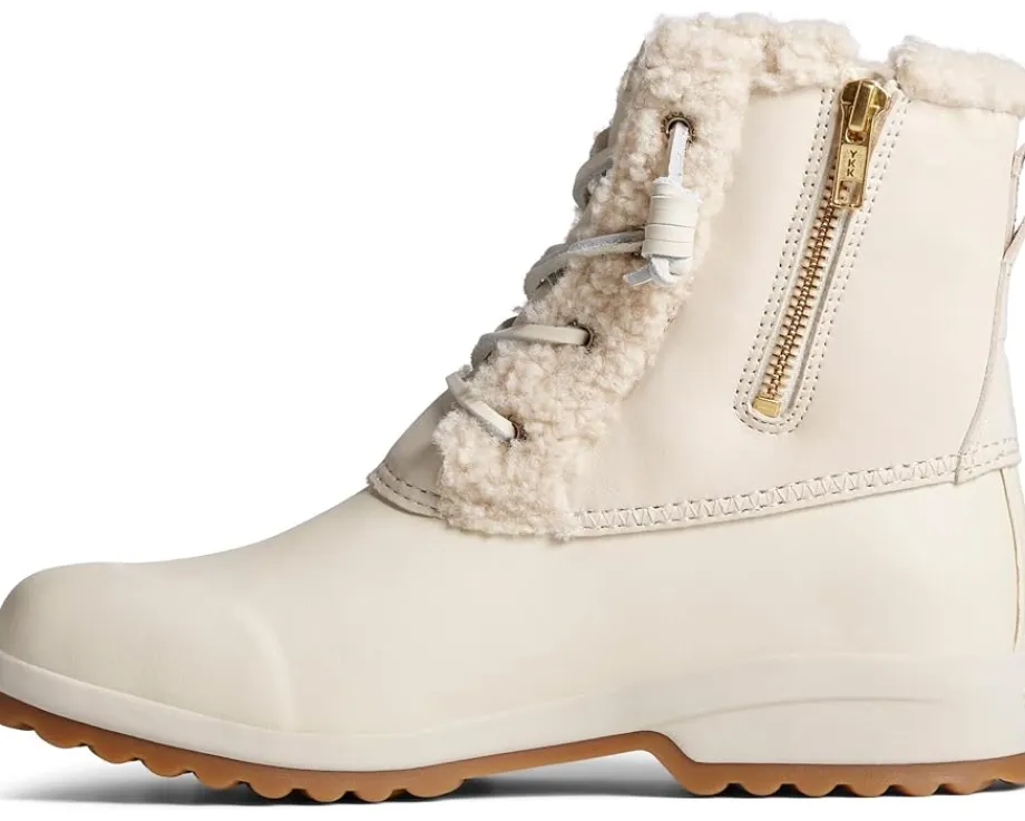 - Stay on your toes throughout the day with comfort and coziness wearing Sperry® Maritime Repel Teddy Trim Boots. The boots are designed to provide warmth and come with a round toe shape, lateral zip & lace detailing for adjustability, and a block heel. These are engineered with a leather and synthetic upper, textile lining, and textile insole.