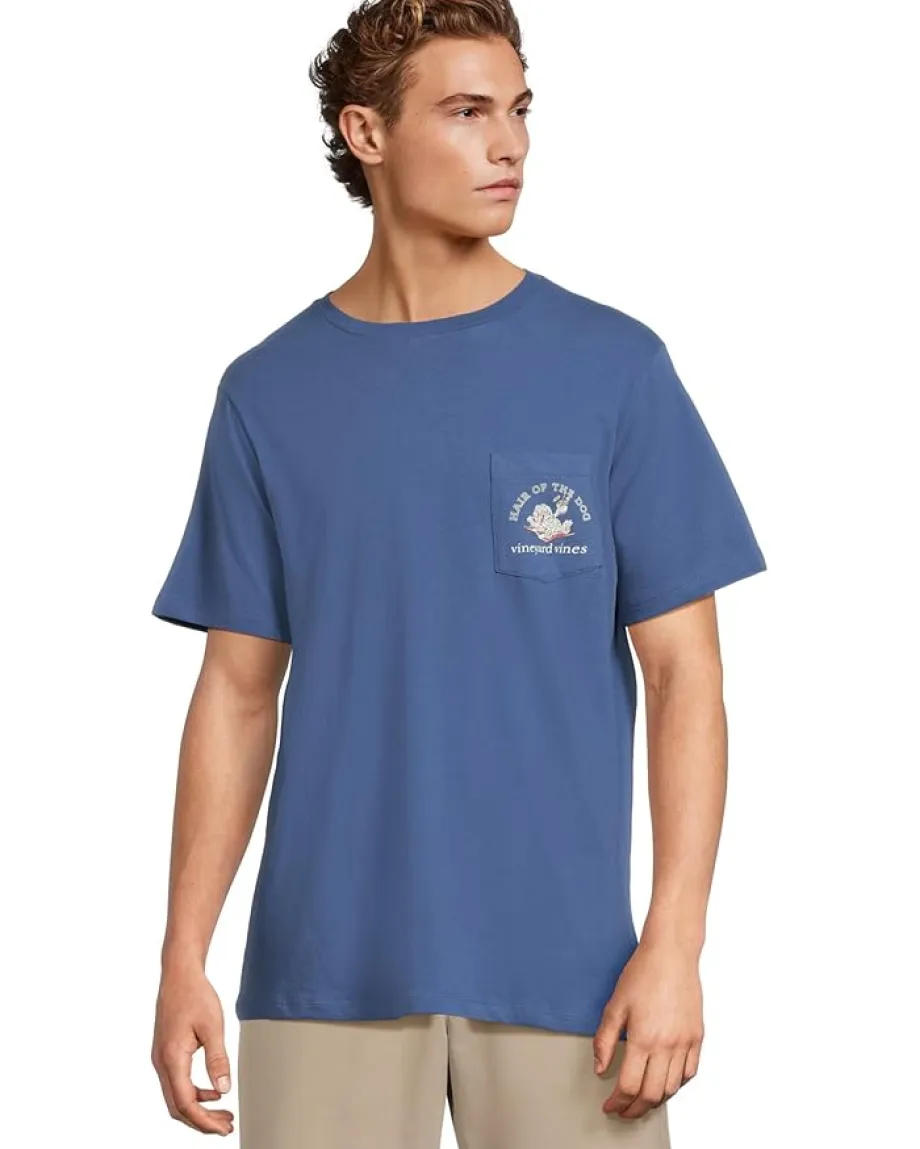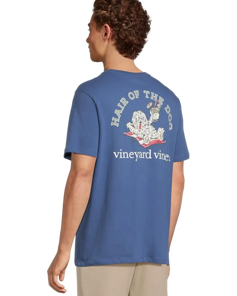 - The Vineyard Vines® Hair Of The Dog Short Sleeve Pocket Tee is the perfect combination of soft, comfortable, and eye-catching. With a relaxed fit that feels just right and plenty of Good Life personality, this casual tee is made for everything from relaxing at home to weekend errands to vacation destinations. It is styled with short sleeves, self cuffs, a ribbed crew neckline, and a self hem. Designed with a graphic design on the chest and back, this soft-washed cotton T-shirt features a classic, relaxed fit for everyday wear.