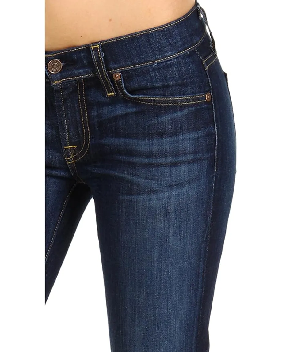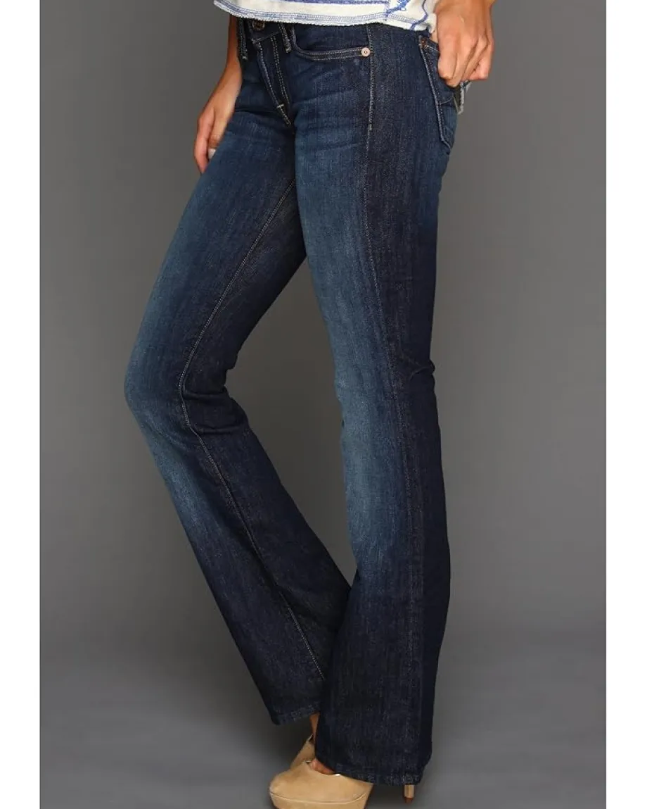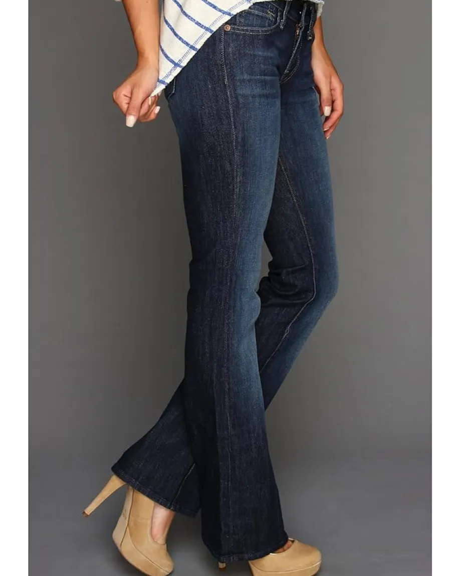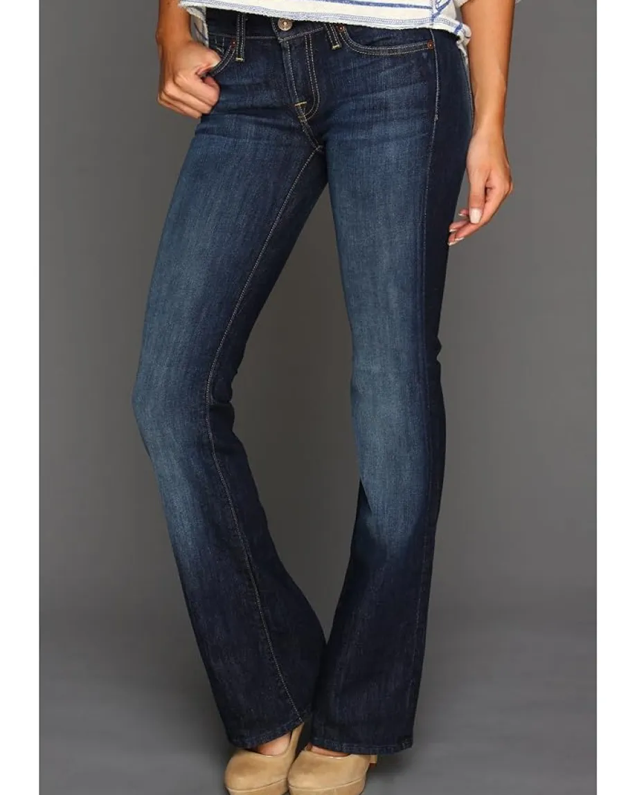- Low-rise jean features a comfortable slim cut in the thigh that widens at the knee to a classic bootcut leg opening.