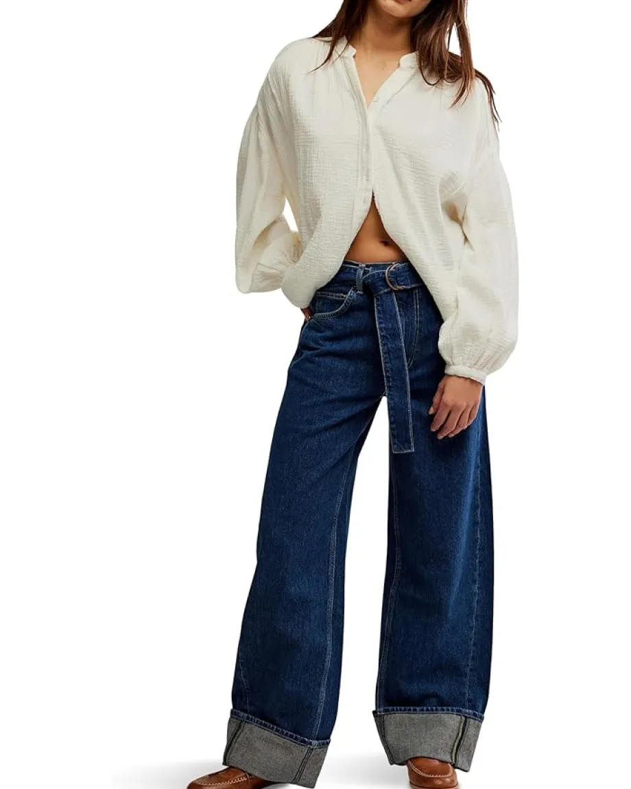 - So cool with retro-inspired charm, this bold pair from We The Free collection is the perfect elevated staple. Featuring a zip-fly with a button closure, five-pocket design, an adjustable self belt, authentic rigid denim, and cuffed hemlines. Off-duty with court sneakers or sleek with kitten heels, this pair has endless ways to wear.