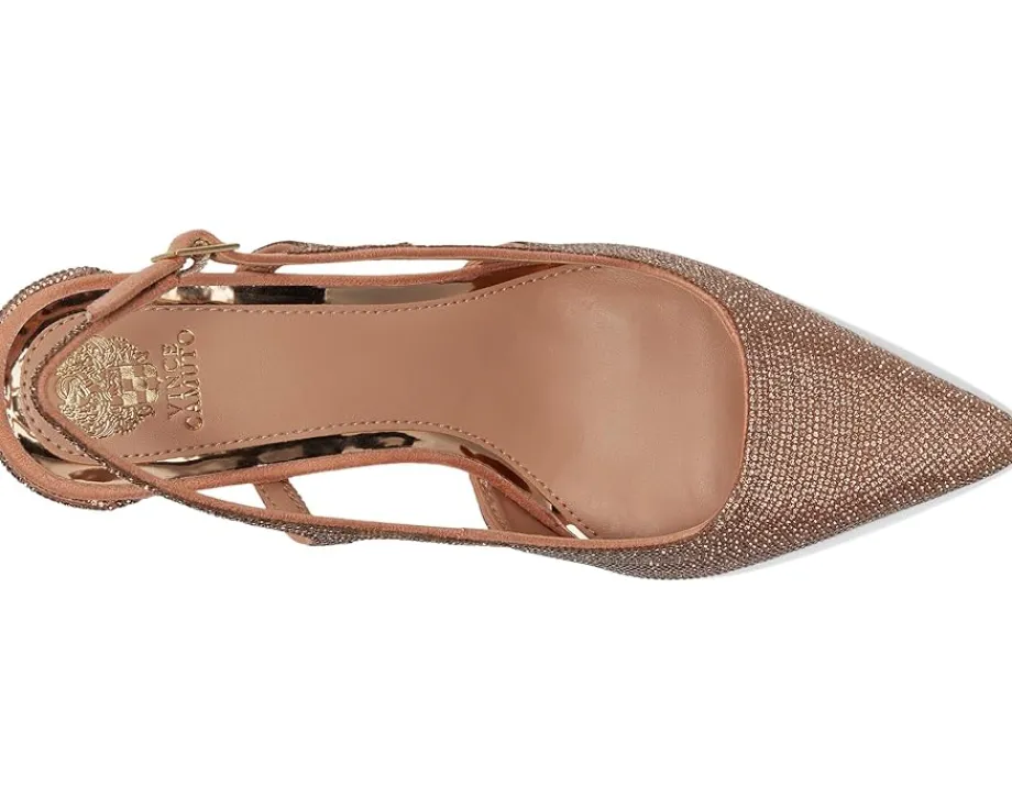 - Amp up your evening style with the Vince Camuto® Sindreea Rhinestone Block Heel Slingback Pump, now with a glamorous refresh. These heels feature all the elements you love: a walkable flared block heel, buckle adjustable sling, and a padded footbed for ultimate comfort. What sets them apart for your night out is the sparkling gems that adorn them, shining bright under the party lights.