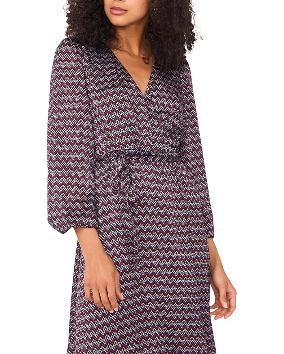 - Get ready to turn heads donning the Vince Camuto® Wrap Front Bubble Sleeve Maxi dress. Featuring a flattering fit-and-flare maxi design and a chic abstract print, this dress is perfect for any occasion. The surplice V-neckline and bracelet-length sleeves with elasticized cuffs add a touch of elegance, while the wrap-front bodice cinches at the waist for a stunning silhouette.