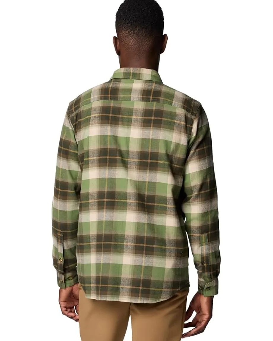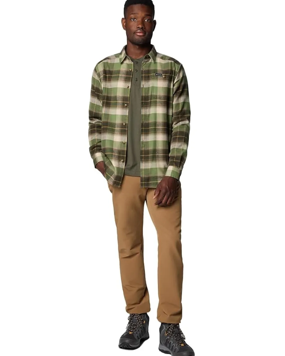 - Constructed from soft cotton flannel with built-in stretch, this Columbia® Cornell Woods™ Flannel Long Sleeve Shirt adeptly transitions from dinner to day job to the outdoor activity of your choosing. It features a regular-fit silhouette, collared neck, button-front closure, long sleeves with buttoned cuffs, one patch pocket on the left chest with an embroidered logo, and an allover checkered print. The shirttail hem gives the whole look a sophisticated touch.