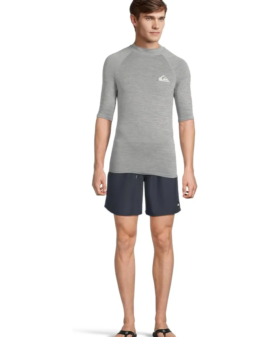- Stay ahead of the tide styling the Quiksilver® Everyday UPF 50 Short Sleeve Surf Tee, crafted for surfers who demand both performance and style. This snug-fit rash guard from the Everyday Collection is made from recycled yarn and infused with UVflight technology, offering 50+ UPF sun protection to keep harmful rays at bay. Moisture-wicking fabric pulls sweat away, ensuring a dry, cool ride, while chlorine resistance boosts durability for endless surf sessions. Featuring a mock neck, short sleeves, and a pullover design, this tee is your go-to for effortless comfort and high-performance action.