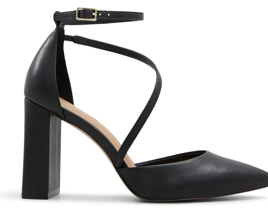 - Step out in style with the ALDO® Milley pumps, a blend of elegance and modern flair. These chic pumps feature a sleek pointed toe and a high block heel that adds just the right amount of height while ensuring stability for all-day wear. The unique wrap-around strap design elegantly encases the foot, leading to an adjustable buckle closure on the ankle strap that ensures a perfect fit and adds sophisticated detail.