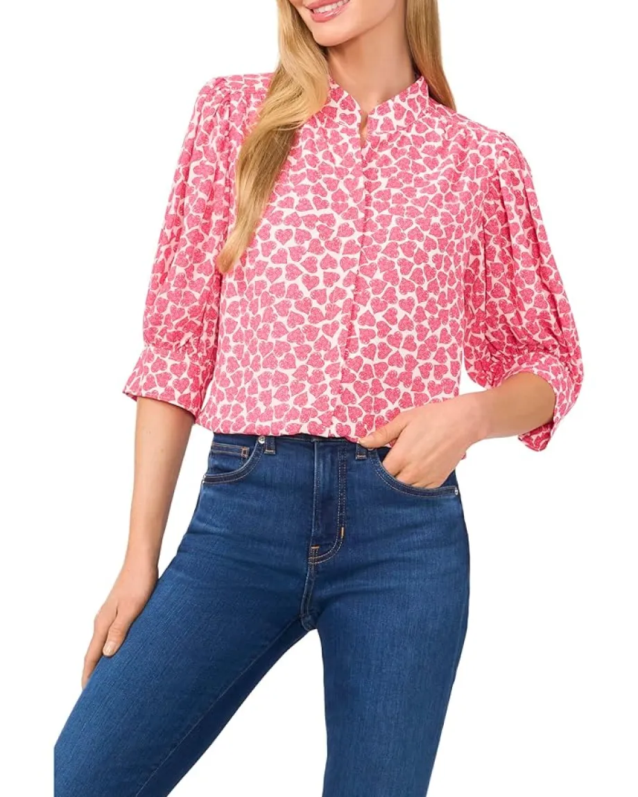 - Modern romance: The CeCe™ Heart Ruched Sleeve Hidden Placket Blouse. Crafted from heavy georgette for a luxurious drape, this blouse features a whimsical heart pattern that brings joy to any outfit. The hidden button placket ensures a polished, seamless look, while ruched quarter sleeves add a touch of romantic flair.