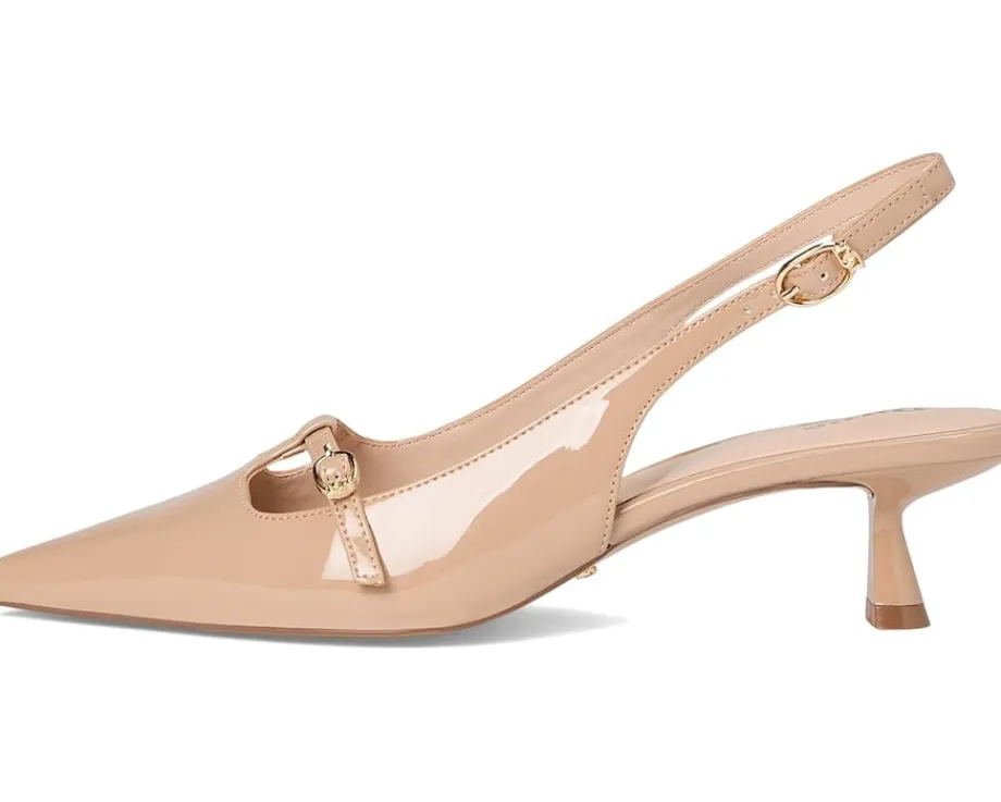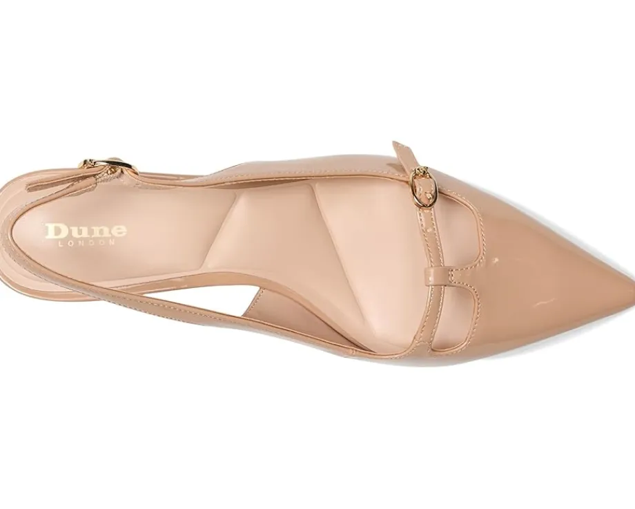 - Chic, polished, and power-ready: Dune London™ Deserving. Crafted with a glossy high-shine patent finish, these heels elevate your office-to-outing wardrobe with effortless charm. The sleek polyester upper pairs beautifully with a pointed toe and graceful kitten heel, giving you height without compromising comfort. Designed with a faux leather lining and supportive TPU insole and outsole, this pair promises durability with every step. A refined slingback buckle closure ensures a secure fit while adding a sophisticated edge.