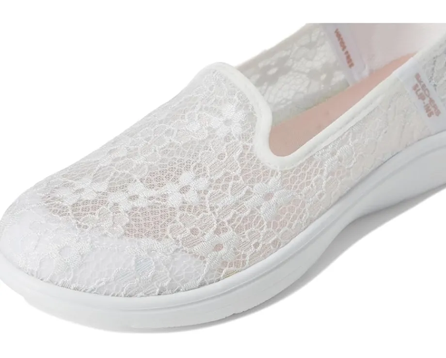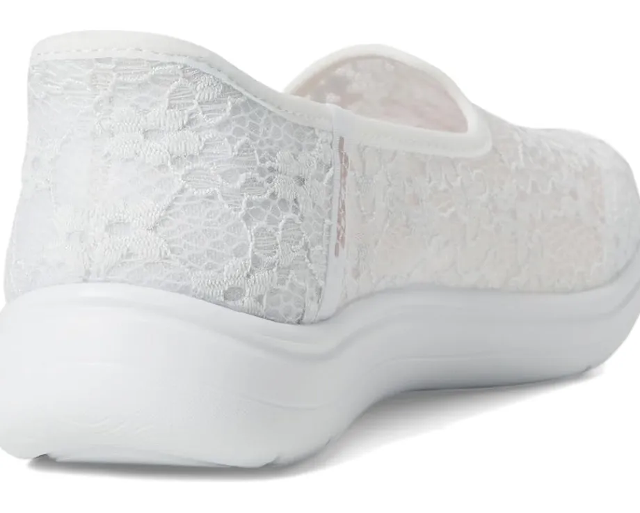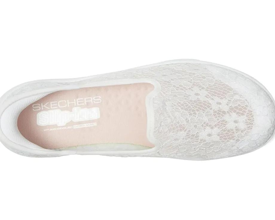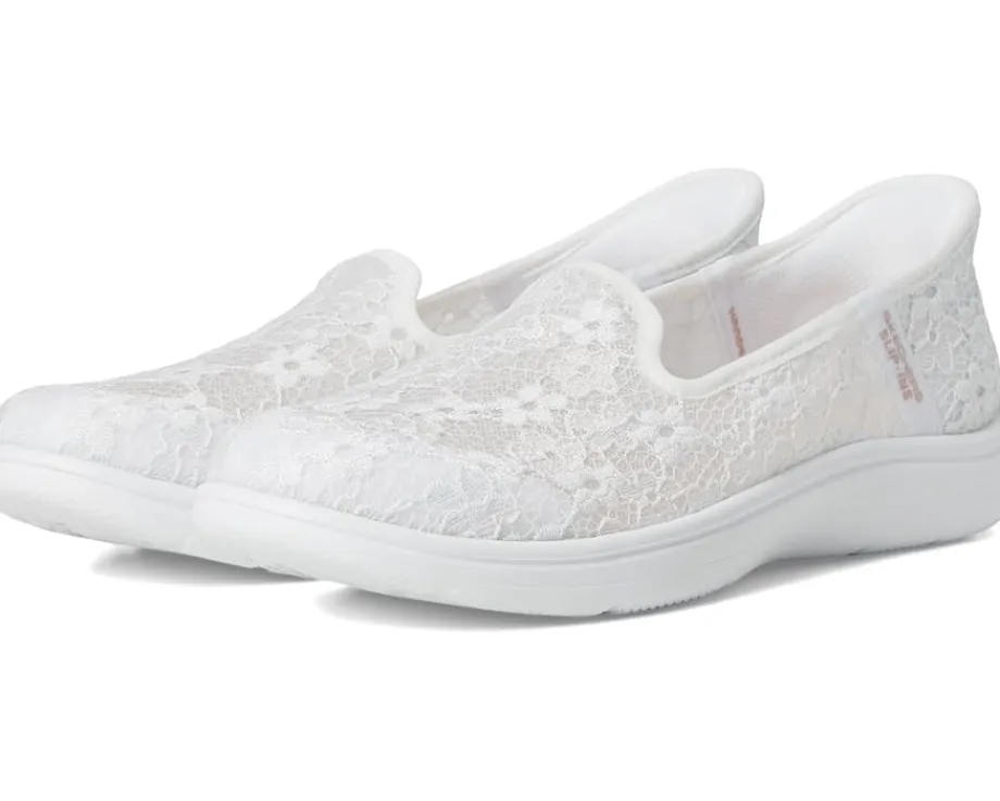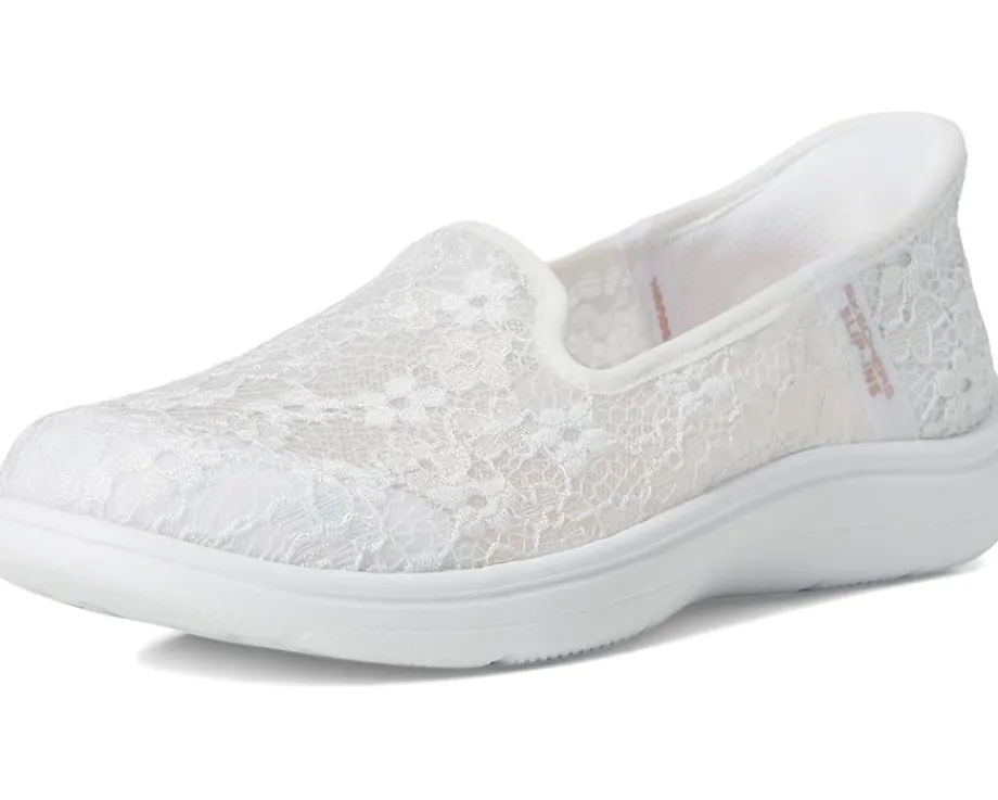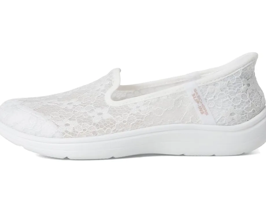- Stylish and versatile comfort combine wearing the Skechers® Performance On-the-GO® Flex Radiant Hands Free Slip-ins® – Blossoms. Designed with Exclusive Heel Pillow™ that holds your foot securely in place, skimmer style features a vegan floral lace upper, high-rebound Skechers Air-Cooled Goga Mat™ breathable insole, and lightweight, responsive ULTRA GO® cushioning.