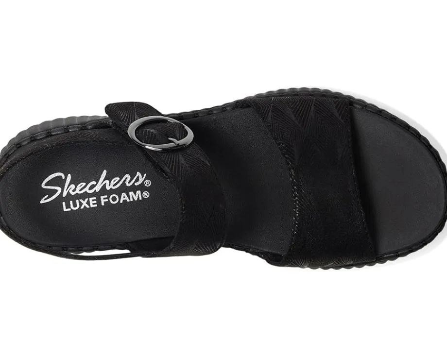 - Enjoy sunny days in breezy comfort with Skechers® Wilshire BLVD – Illusion of Love. Crafted from textured vegan shimmer suede upper with adjustable strap and buckle, this pair of sandals features open round toe, luxe foam cushioned comfort footbed, midsole stitching trim, low heel, and brand detailing on the footbed.