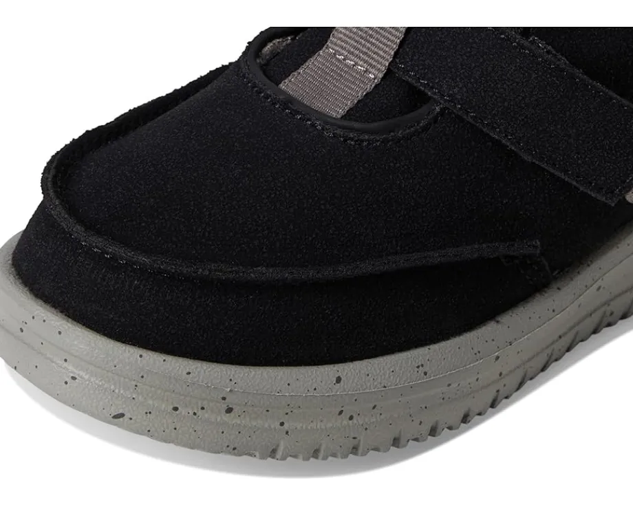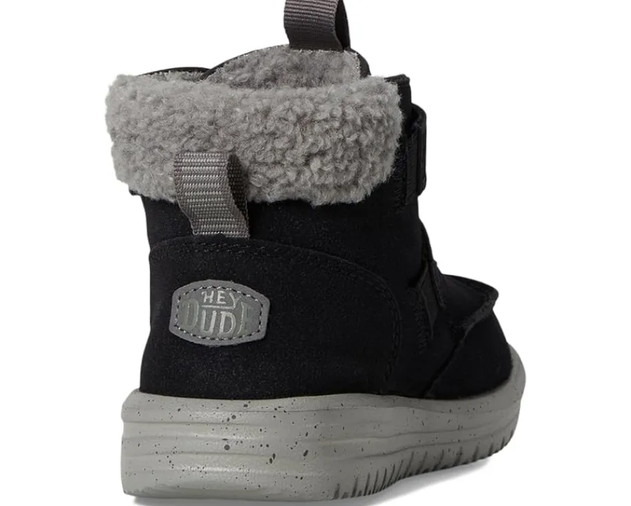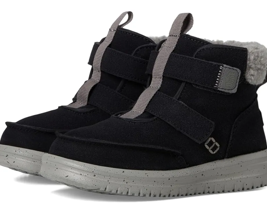 - Worn-in jeans and zip-up hoodies. Bye-bye suntans and long summer nights. Say hello to the Hey Dude® Kids Bradley Cozy boots, designed for crisp fall days. Their faux suede upper features dual hook-and-loop straps for a secure fit and pull loops at the front and back for easy on and off. These ankle-high boots are made of a removable foam insole and a faux fur lining. These kids’ boots are the cutest boots on the block.