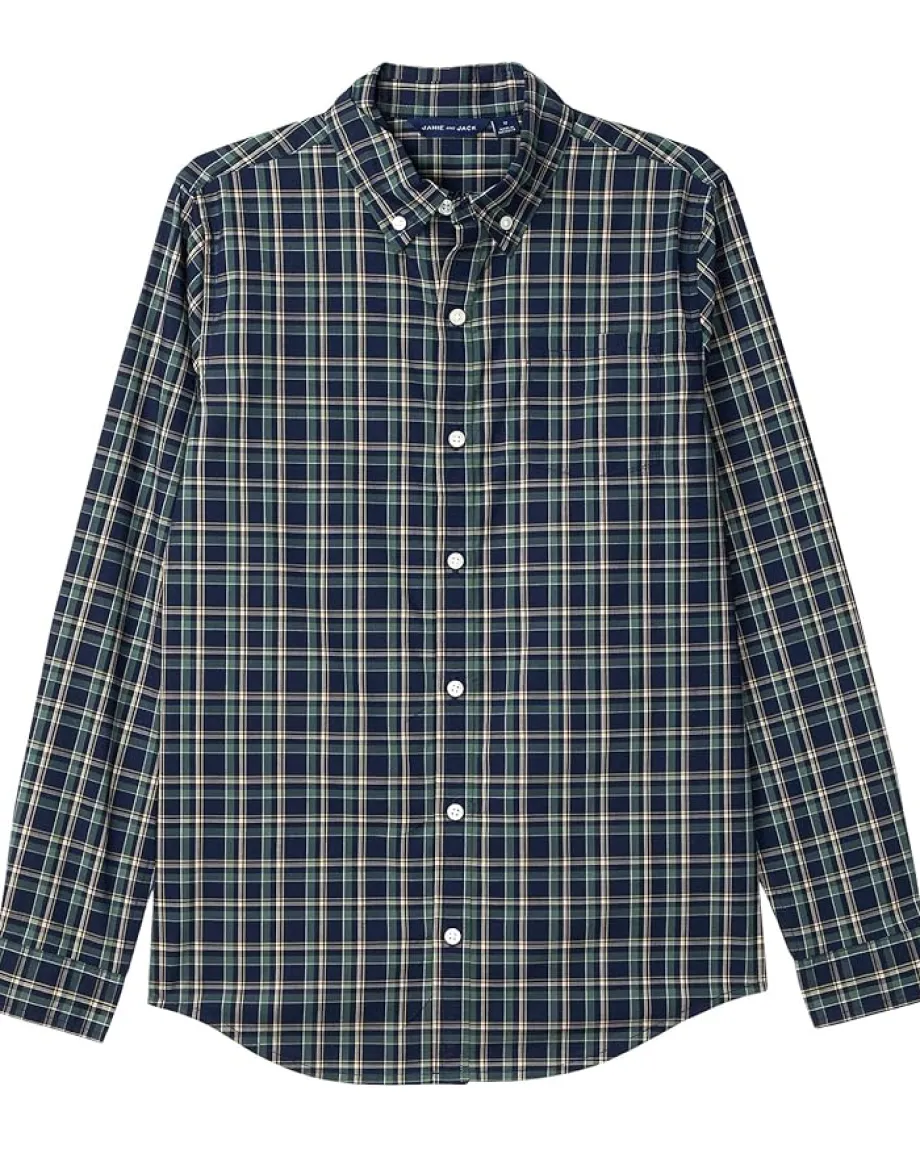 - The Janie and Jack® Plaid Poplin Button Down Shirt is crafted from cotton that offers all-day comfort and breathability. Its allover plaid pattern offers a classic look, while the buttoned front closure ensures easy wear. This patterned shirt is designed with long sleeves, buttoned cuffs, a collared neckline, and a straight hem.