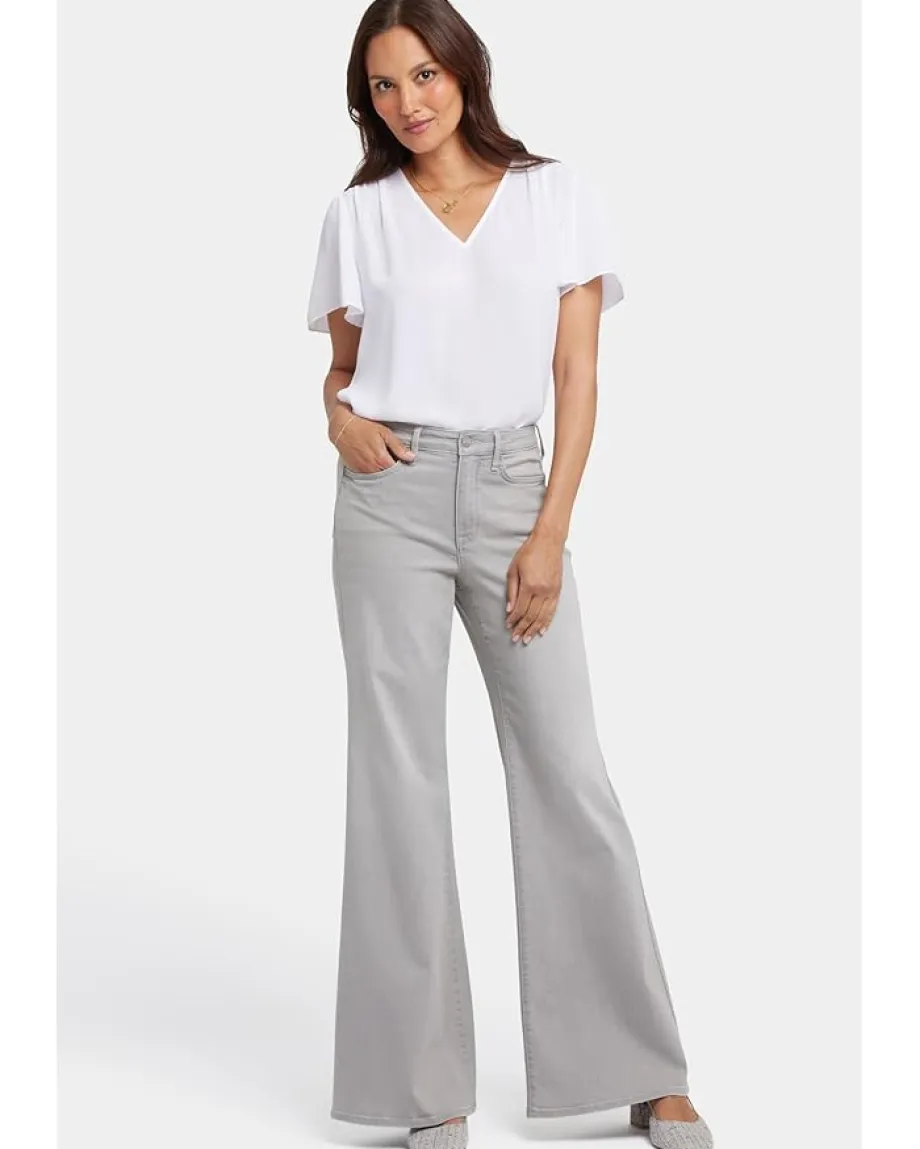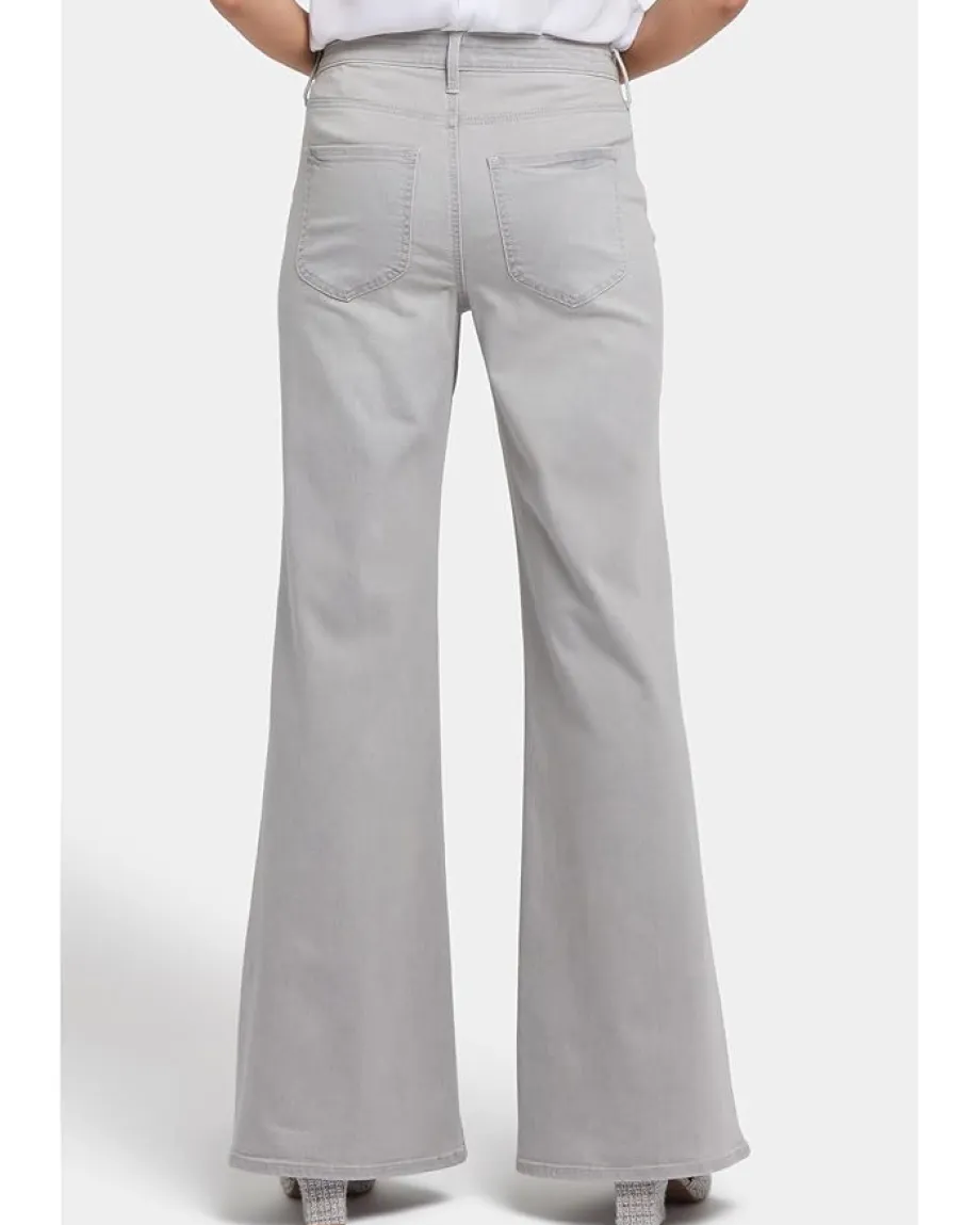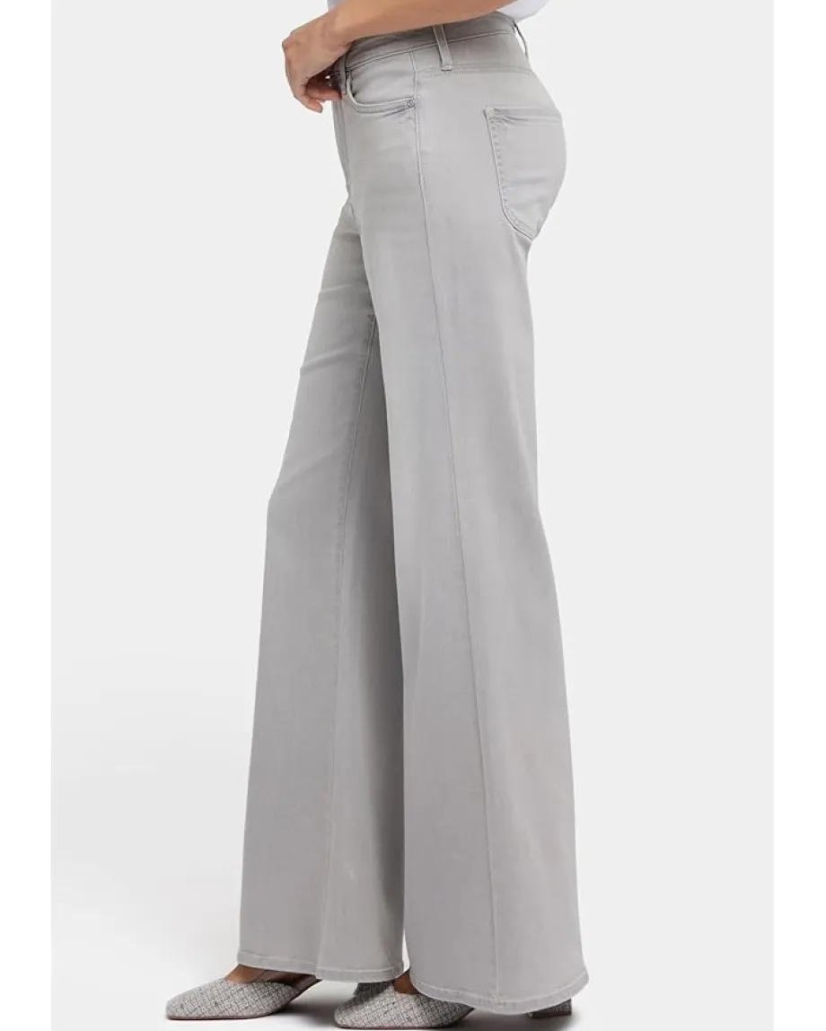 - The NYDJ® Mia Palazzo Jeans in Grenada Mist make a bold, breezy statement with their super-flared legs. Sitting high on the waist, this pair has a flattering fit that hugs the hips and thighs and is detailed with center-leg creases. Made with Lift Tuck® Technology to flatten in the front and flatter curves in the back, it features relaxed fit, pleated front, wide-leg silhouette, beltloop waistband, zip-fly, button closure, and classic five-pockets style.