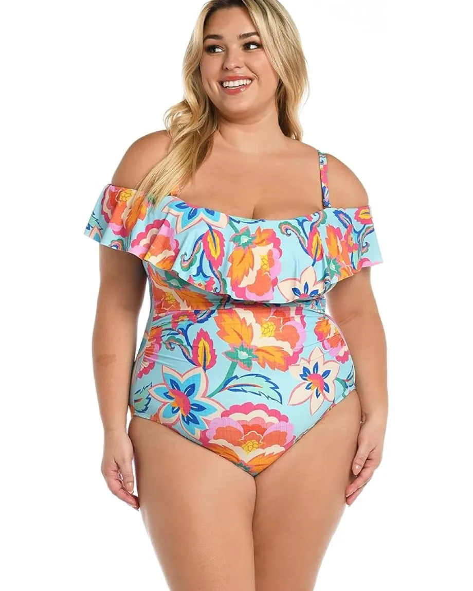 - Take the style statement at beach a bit higher wearing La Blanca® Breezy Beauty Off-the-Shoulder Ruffle Mio Swimwear.