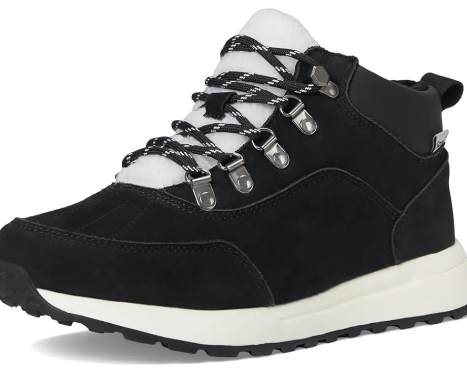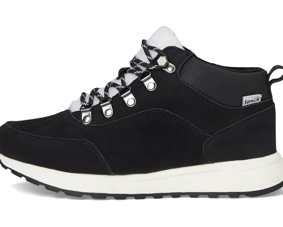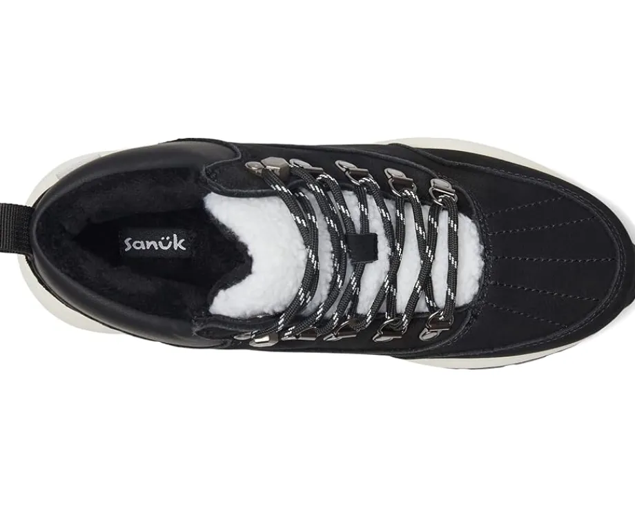 - Take every step with improved comfort and style wearing the Sanuk® Apres Me Shoes. Tropically applied water-repellent treatment combines with this nubuck mid-cut construction, along with faux shearling tongue, toe, and heel protection. Gusseted tongue helps to keep the elements out. High pile fleece lining keeps the coziness in, while the athletic midsole paired with durable rubber outsole allows for easy outdoor transition.