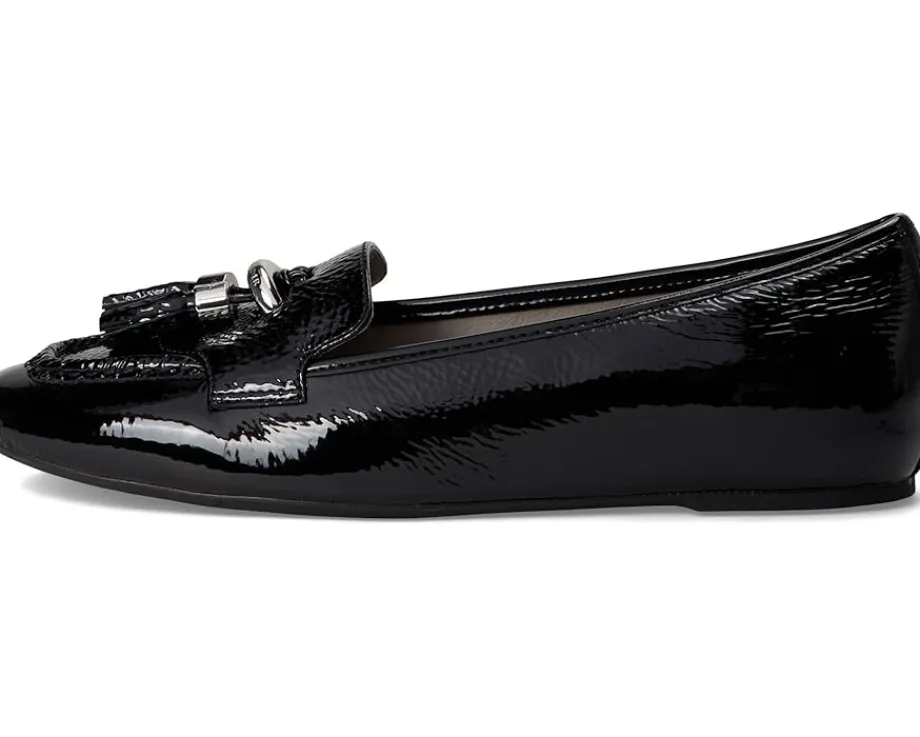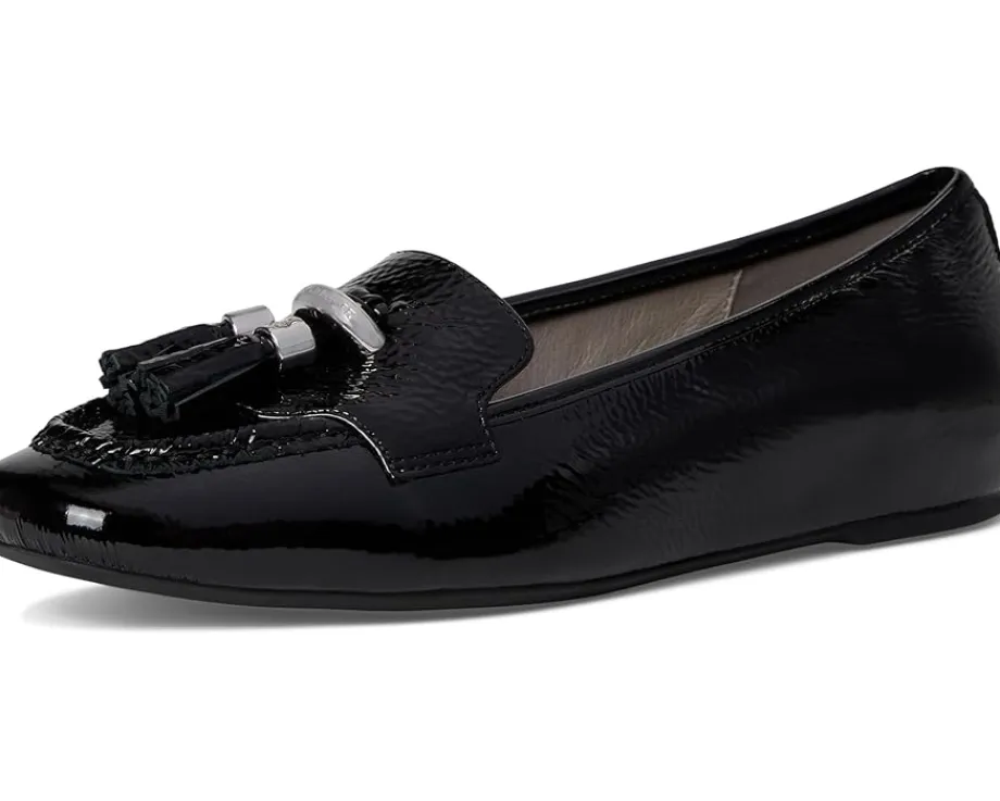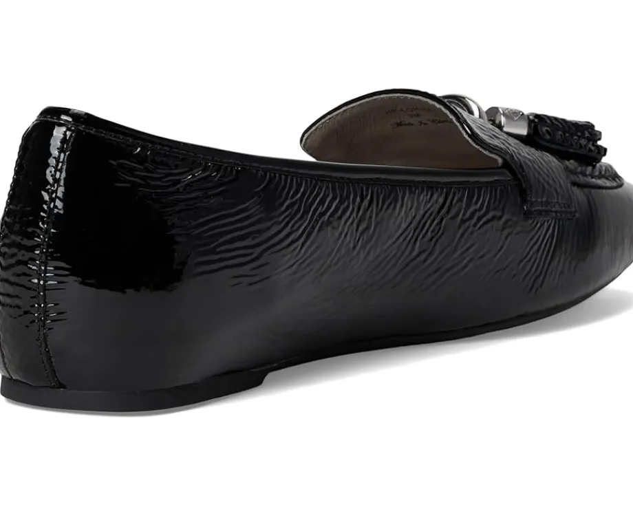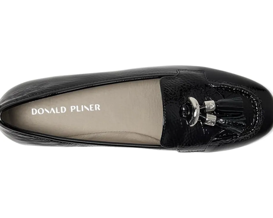 - The Donald Pliner® Loriel loafer fuses timeless glamor with modern comfort for everyday versatility. Crafted with a luxurious leather upper, lining, and insole, this black patent loafer brings a high-shine finish that instantly elevates any look. The signature logo D-ring ornament, and tassel detail add a touch of refinement, while the polished silver-tone hardware creates a sleek, contemporary edge. Designed with a lightweight, flexible rubber outsole, it delivers all-day comfort without sacrificing style. With its pull-on construction, the Loriel makes getting ready effortless, whether you’re dressing for work or weekend outings.