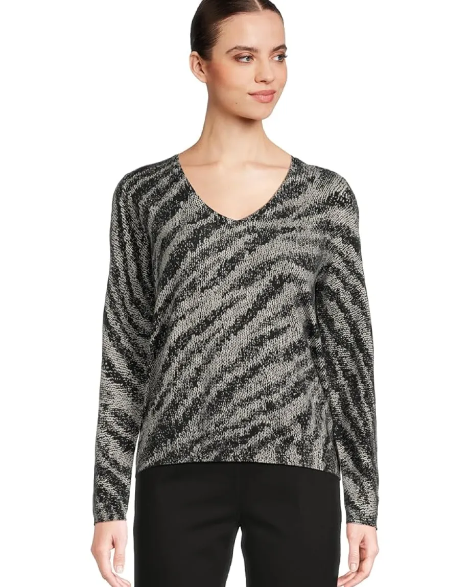 - Embrace warm and cozy vibes wearing the Elliott Lauren™ Zebra Crossing – Printed V-Neck Sweater. The pullover-style sweater features a V-neckline, long sleeves, an allover zebra pattern, and a straight hem.