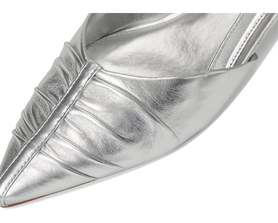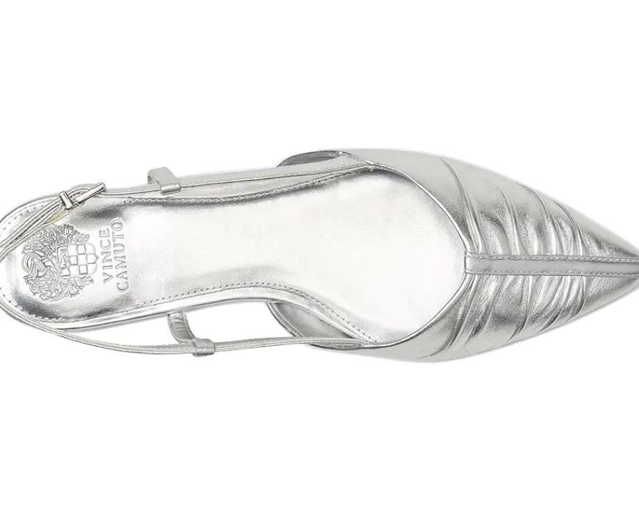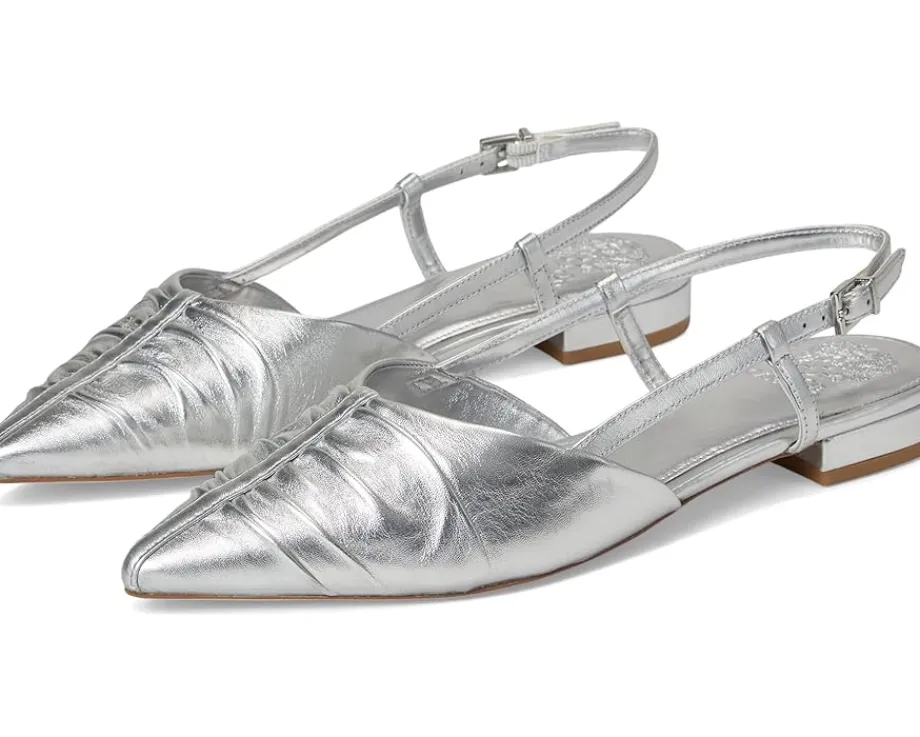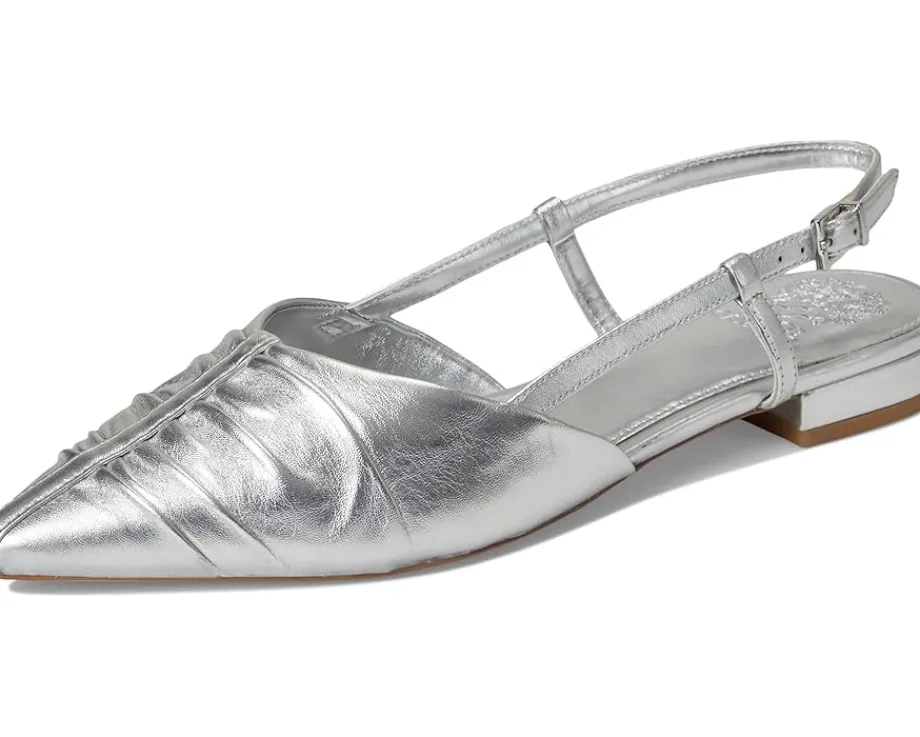 - Step into effortless sophistication wearing the Vince Camuto® Agnes Bunched Toe Slingback Flat Mule. Crafted from buttery leather and soft suedes, these pointed-toe flats bring a touch of refinement to any look. The delicate pleated detail along the vamp adds texture and charm, while the adjustable slingback strap ensures a secure, customized fit. Designed for all-day wear, the padded footbed delivers cloud-like comfort, and the faux leather insole enhances the luxe feel. Finished with a sleek synthetic rubber outsole, these flats offer the perfect blend of style and practicality, effortlessly taking you from desk to dinner.
