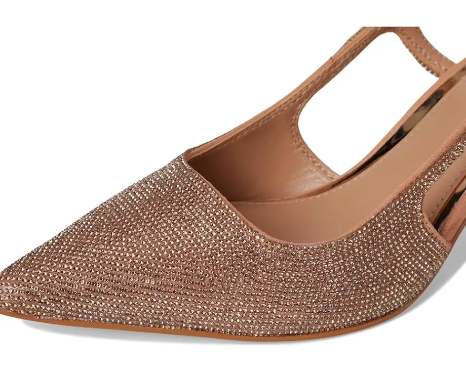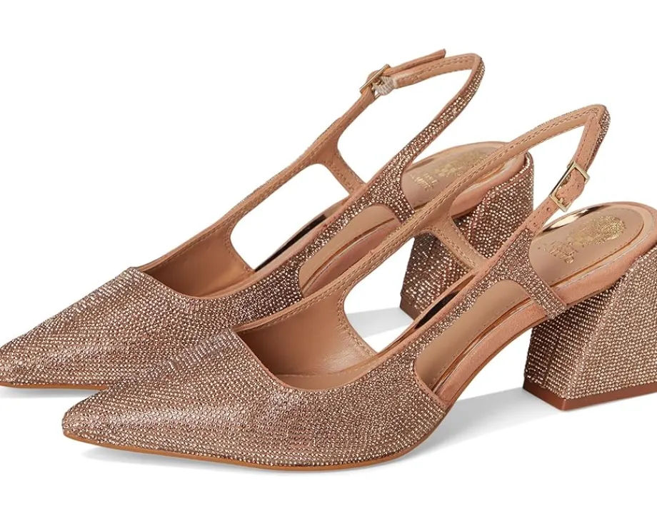 - Amp up your evening style with the Vince Camuto® Sindreea Rhinestone Block Heel Slingback Pump, now with a glamorous refresh. These heels feature all the elements you love: a walkable flared block heel, buckle adjustable sling, and a padded footbed for ultimate comfort. What sets them apart for your night out is the sparkling gems that adorn them, shining bright under the party lights.